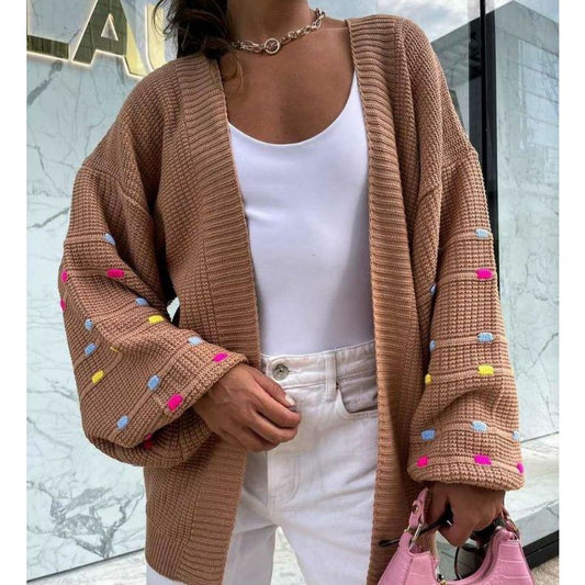 Casaco Feminino Cardigan Tricô Grosso Longo Com detalhe Manga Colorida