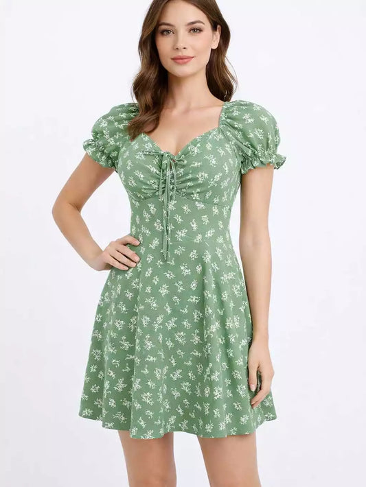 Vestido Curto Feminino Floral com Manga Curta e Laço no Busto