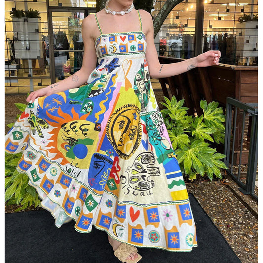 Vestido Feminino Longo Estilo Camisole Estampado com Alças Finas e Costas Abertas