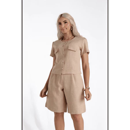 Economize 17%Bermuda Feminina em Linho Rústico com Fechamento Frontal