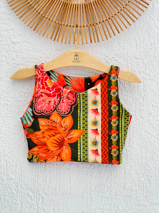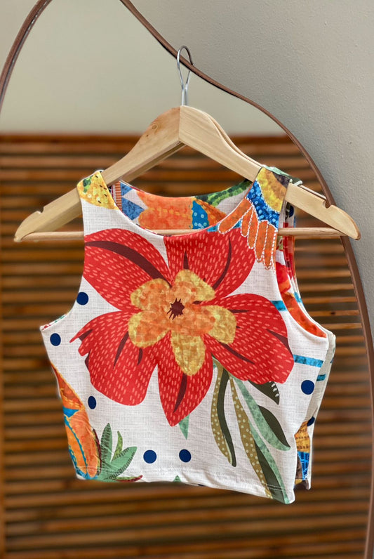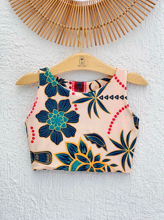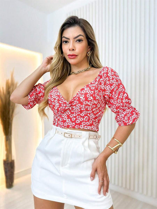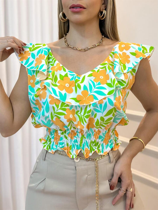 Economize 12%Cropped Feminino Florido com Lastex e Babado