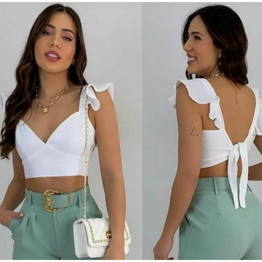 Cropped Feminino Com Decote em V Delicado e babado Top Blusa Corselet Amarração