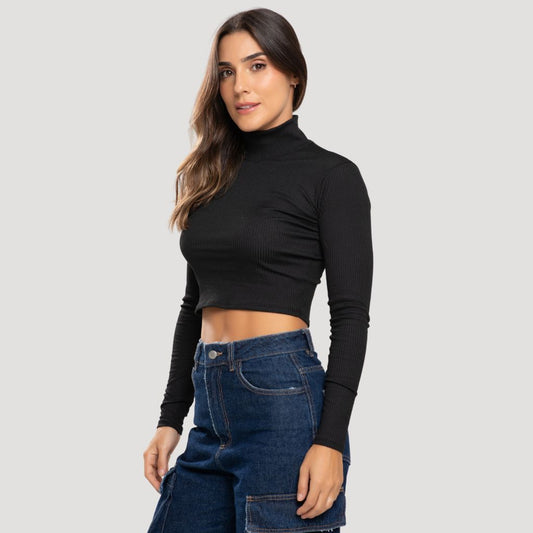 Economize 31%Cropped Manga Comprida Gola Alta Canelado