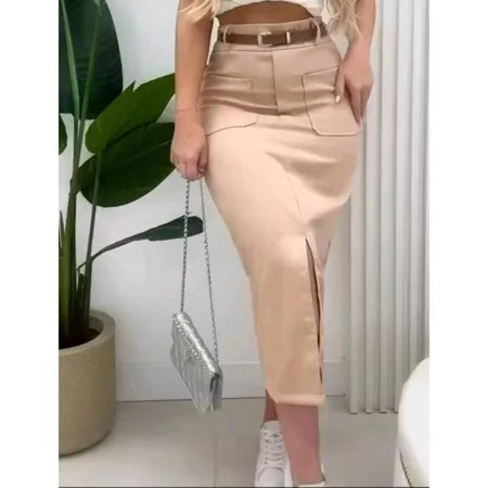 Saia Longa Monocromática em Alfaiataria com Bolsos, Zíper, Botão e Cinto