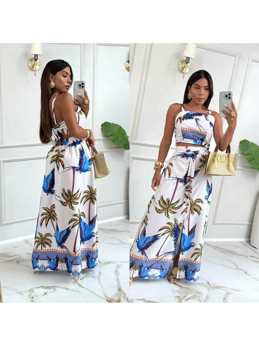 Conjunto Feminino Tomara Que Caia Cropped e Saia Longa Estampa Tropical Inspiração Farm