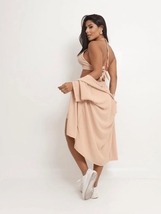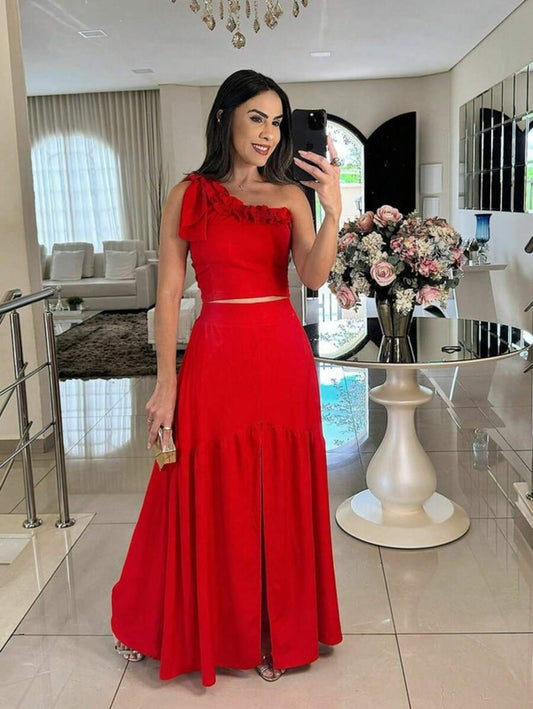 Conjunto Feminino Cropped Assimétrico com Bojo e Saia Longa com Abertura Frontal