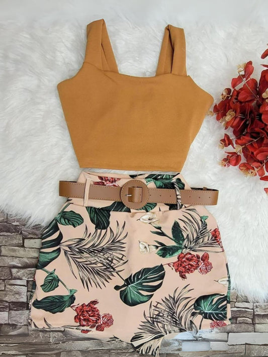 Conjunto Feminino Blusa Cropped + Short Saia com Cinto Plus Size - Conjuntinho Plus Curve