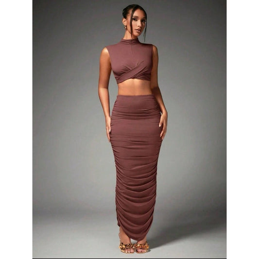 Conjunto Saia Drapeada Midi com Cropped Transpassado Colado Modela
