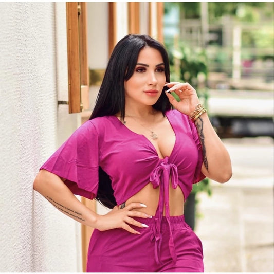 Cropped Feminino Com Decote em V Delicado e babado Top Blusa Corselet Amarração