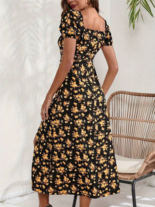 Economize 14%Vestido Longo Floral com Decote Quadrado e Fenda