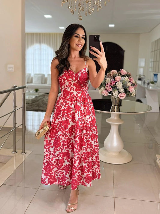 Vestido Feminino Longo Estilo Camisole Estampado com Alças Finas e Costas Abertas