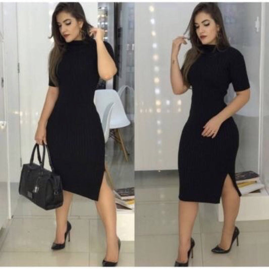 Economize 18%Vestido Midi Canelado Gola Alta e Fenda na Lateral