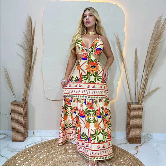 Vestido Longo Feminino Estampado Casual com Amarração nas Costas