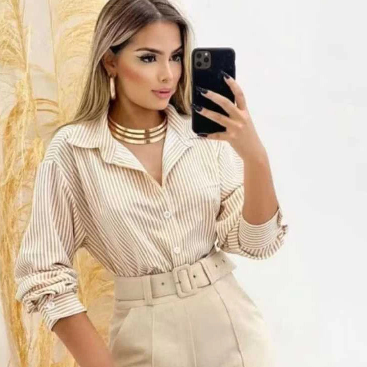 Não perca: Garanta agora sua camisa social feminina listrada e experimente o equilíbrio perfeito entre conforto e estilo. Adicione ao carrinho e renove seu guarda-roupa com elegância!