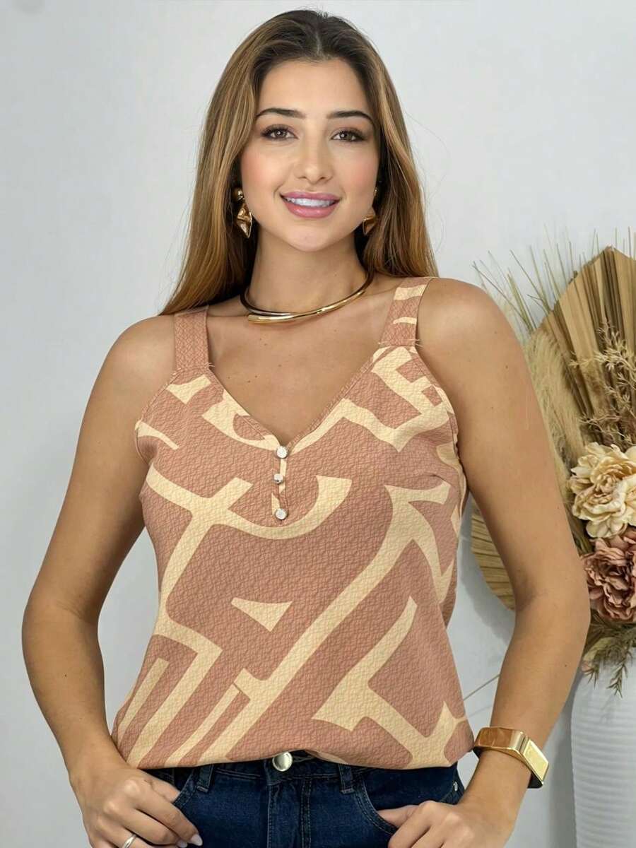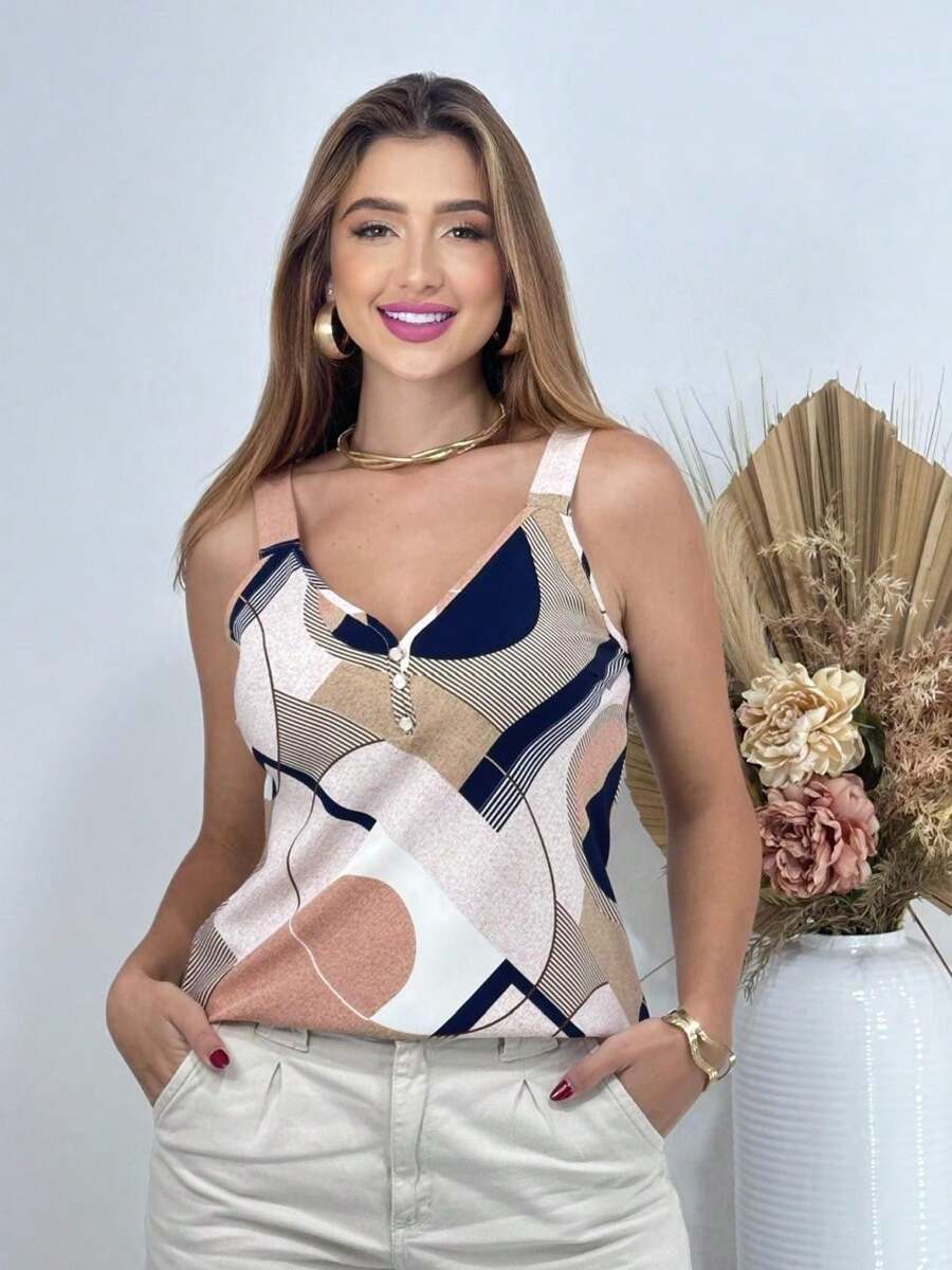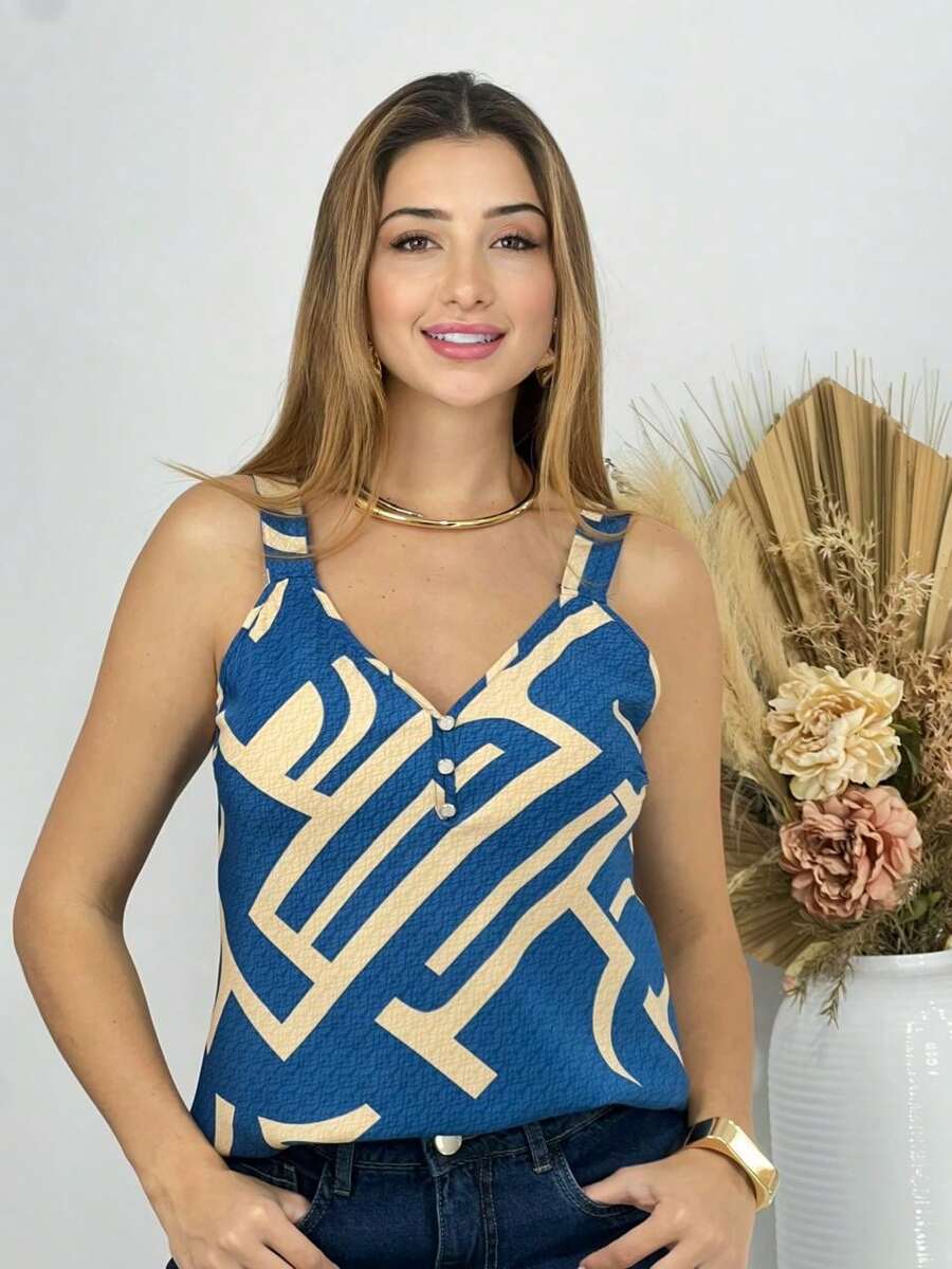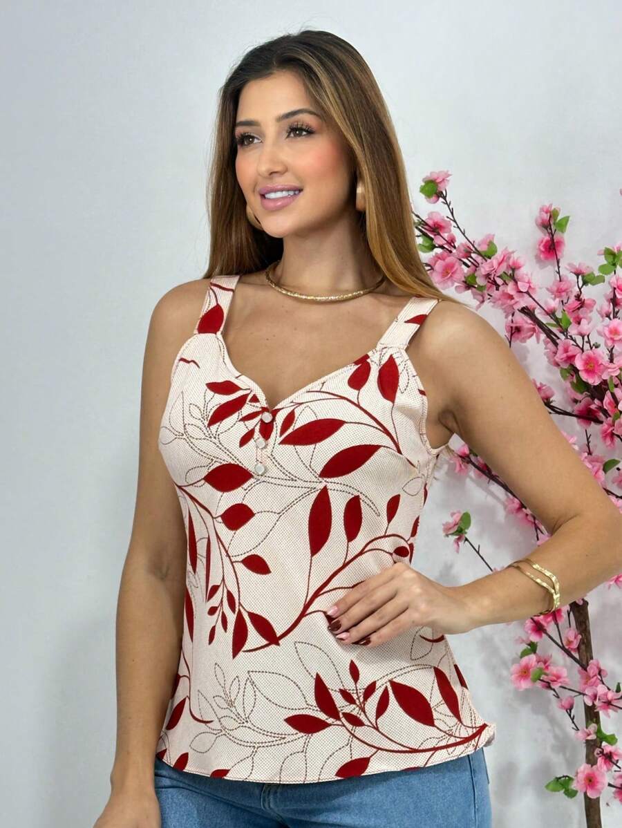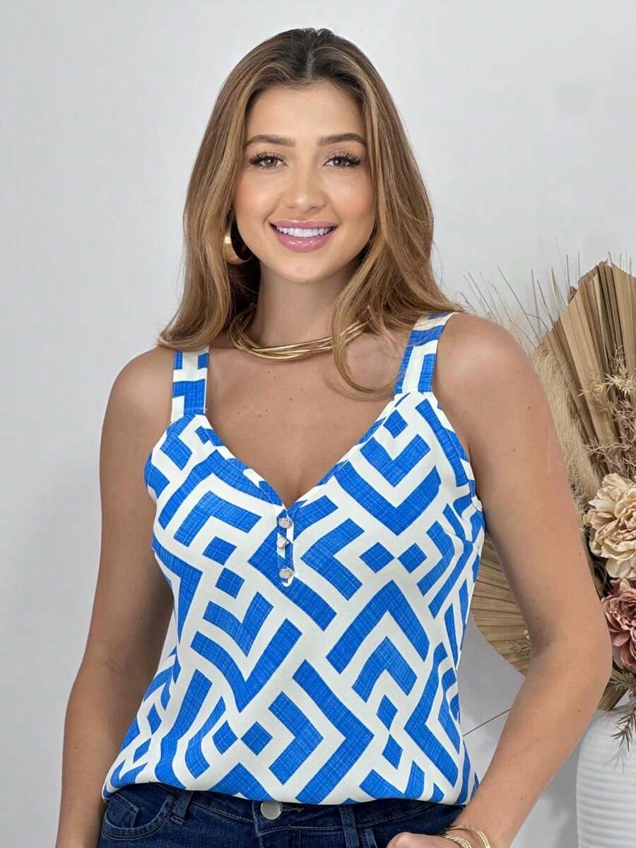 Regata Feminina Social – Estampada com Botões e Alça Larga