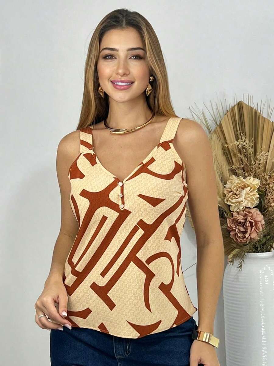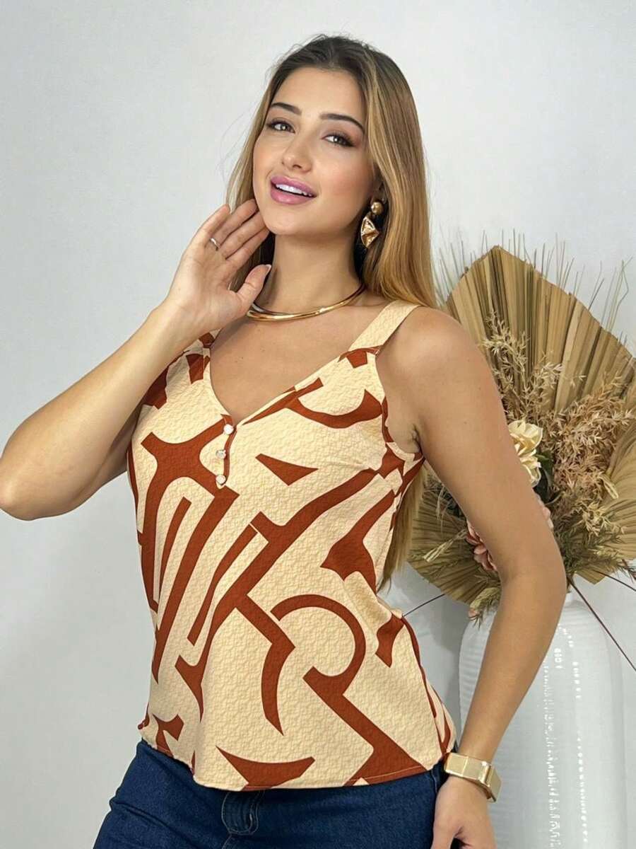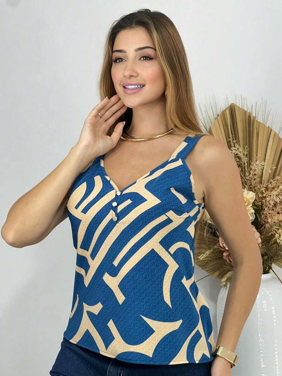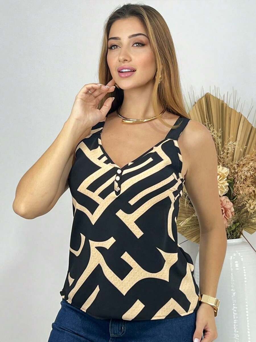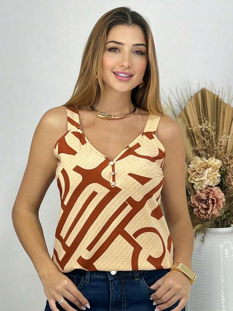 Regata Feminina Social – Estampada com Botões e Alça Larga