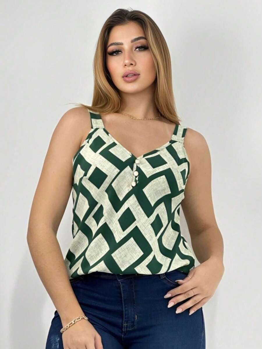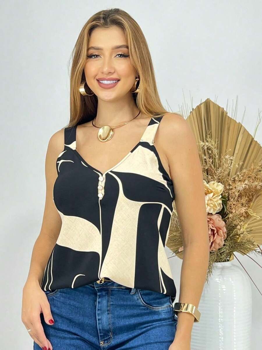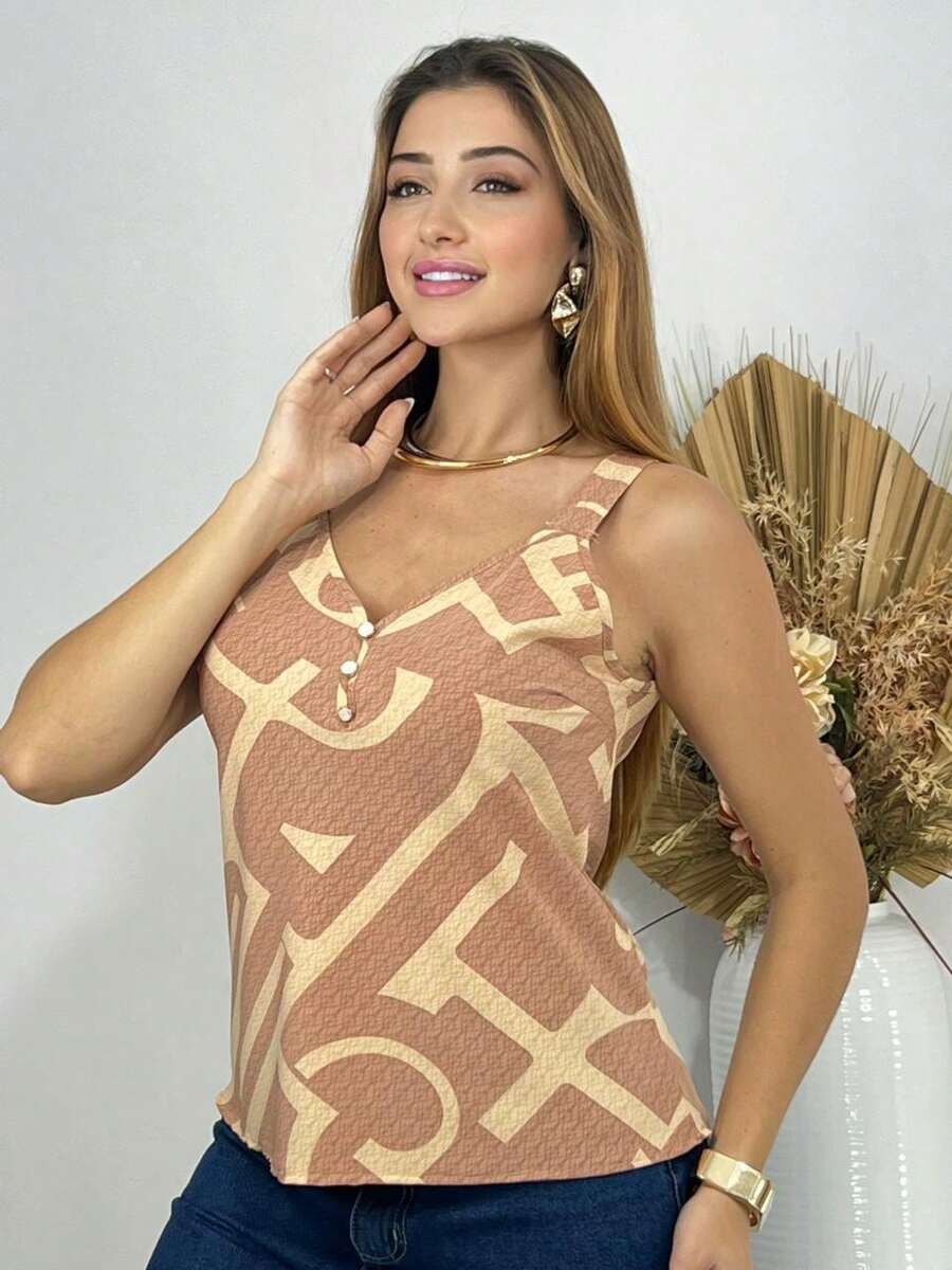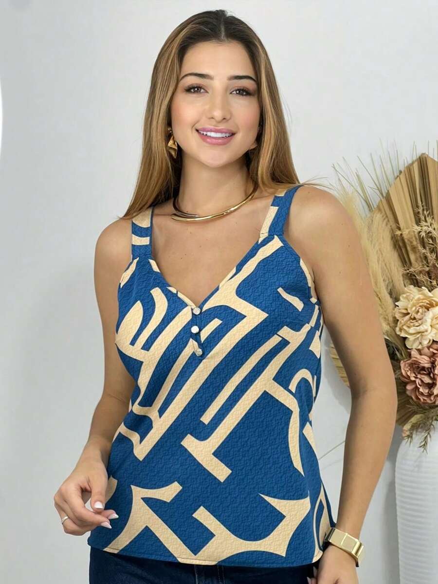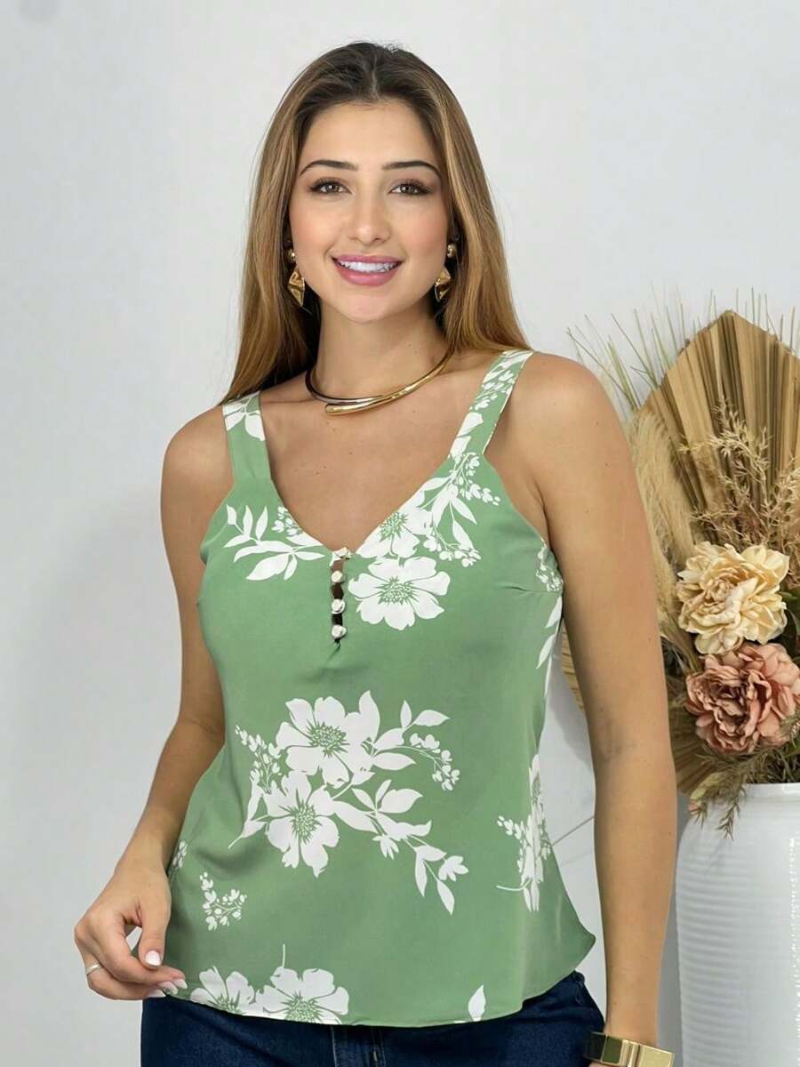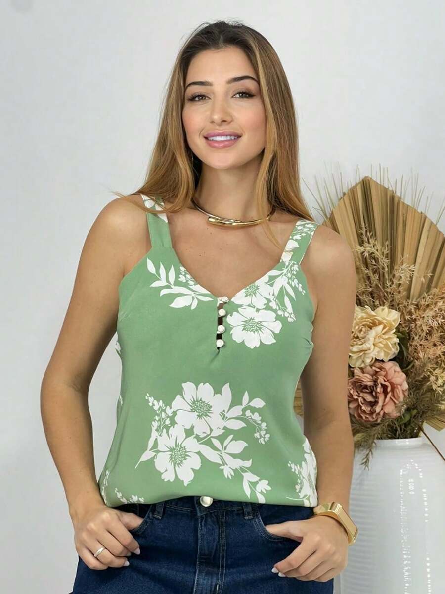 Regata Feminina Social – Estampada com Botões e Alça Larga