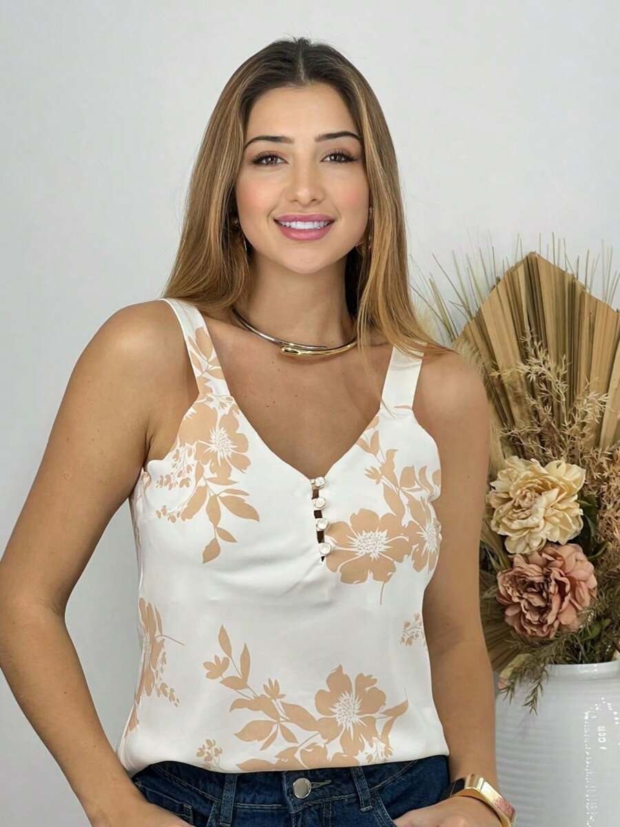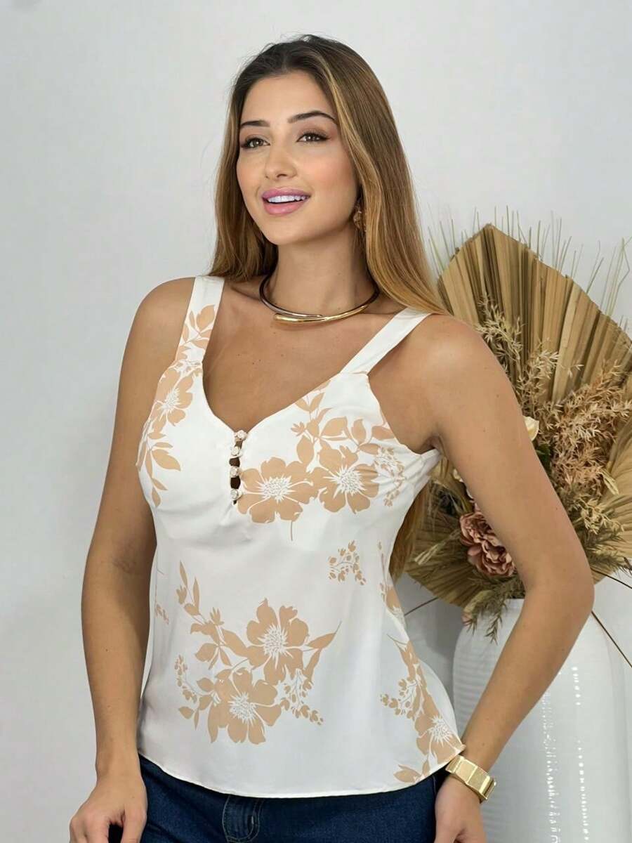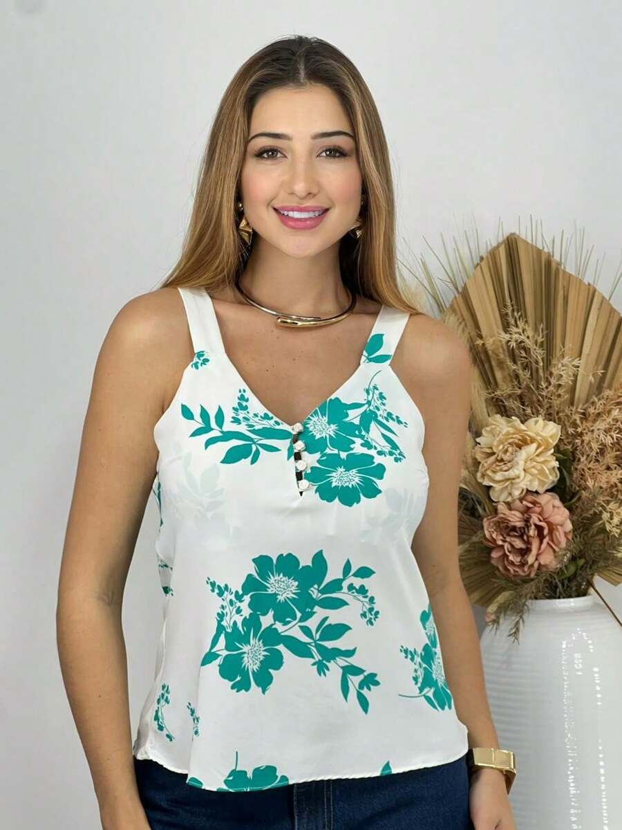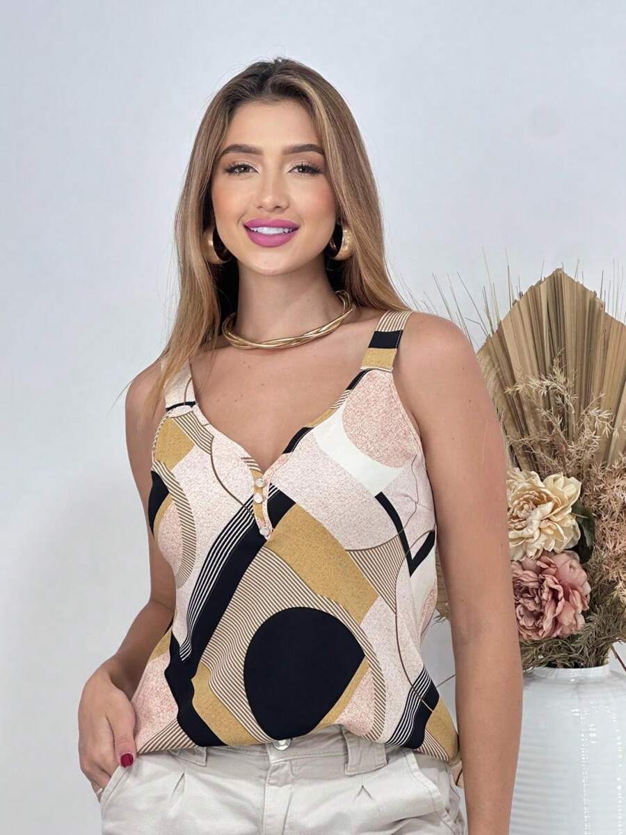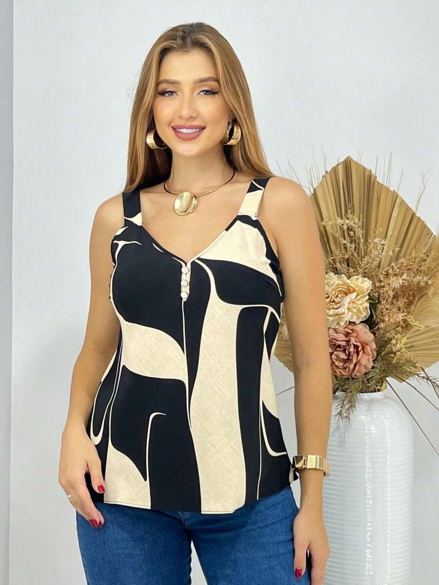 Regata Feminina Social – Estampada com Botões e Alça Larga