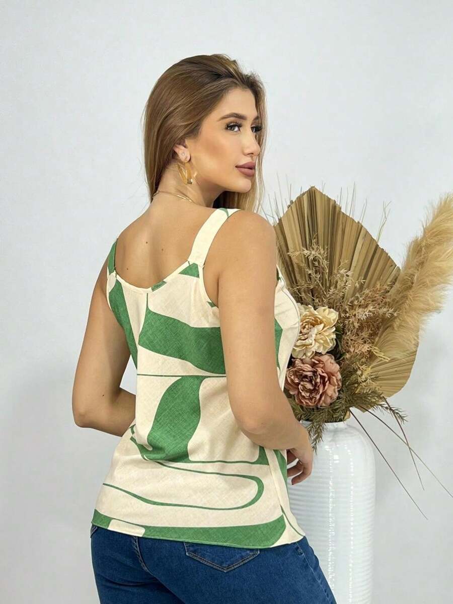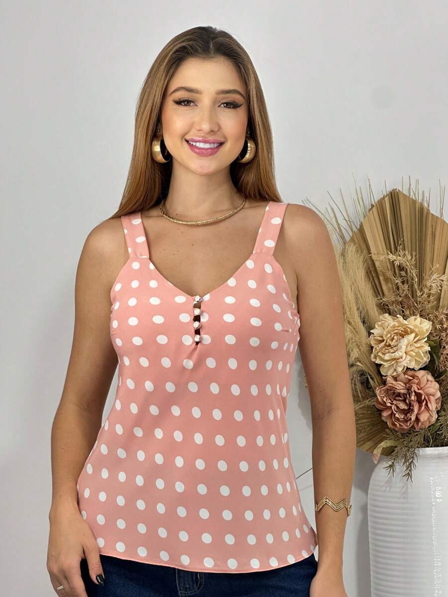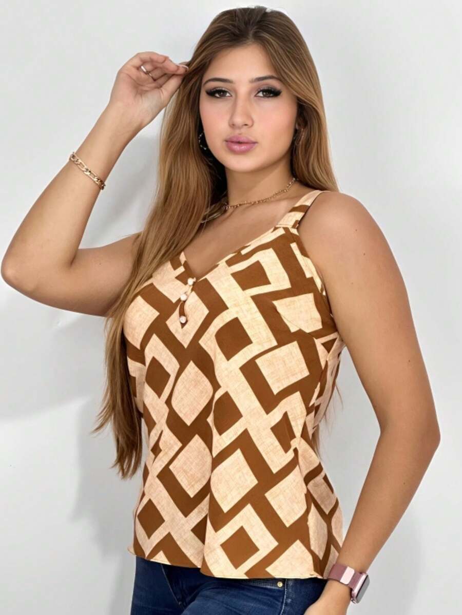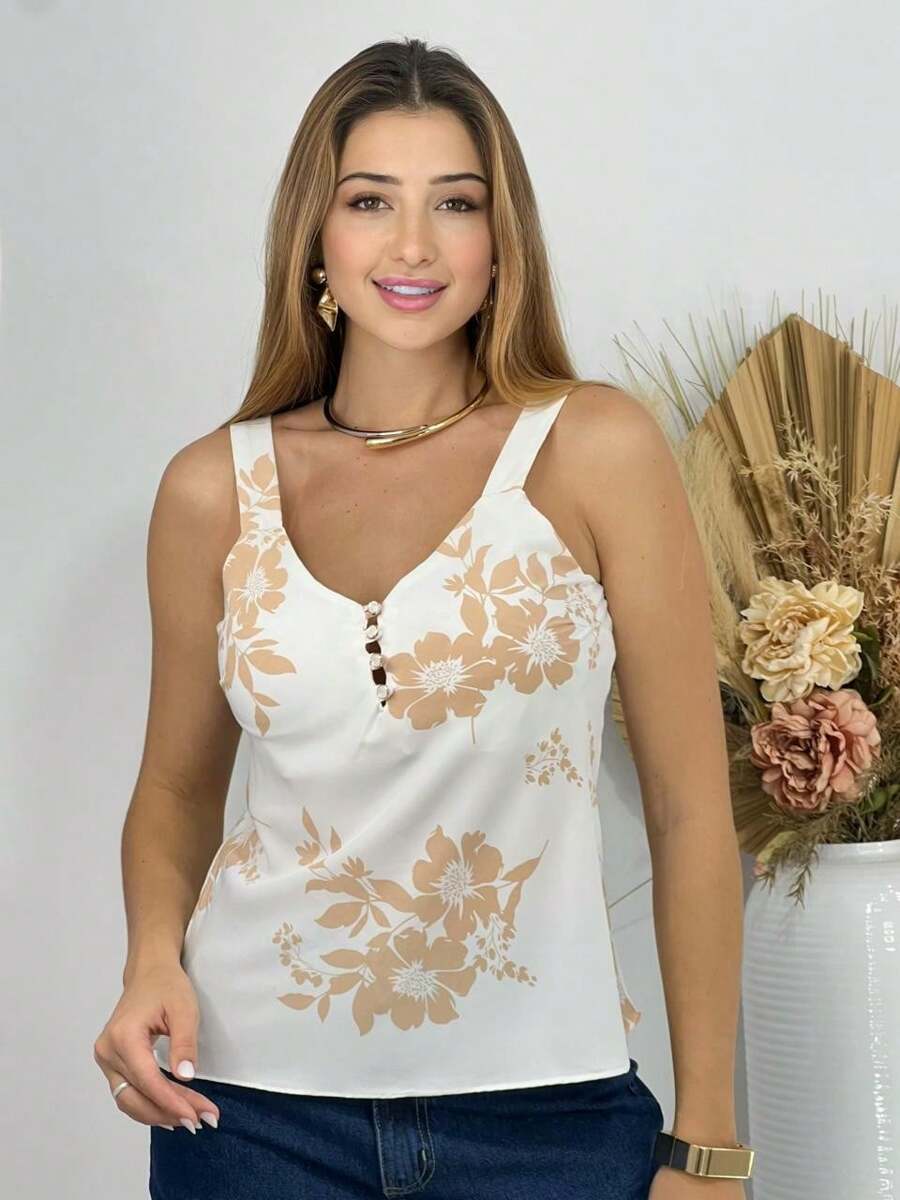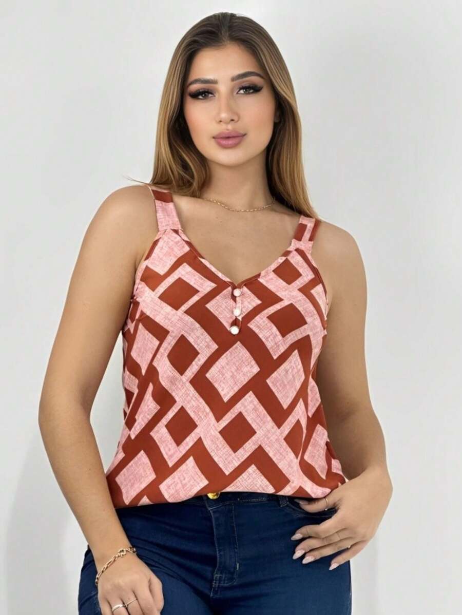 Regata Feminina Social – Estampada com Botões e Alça Larga
