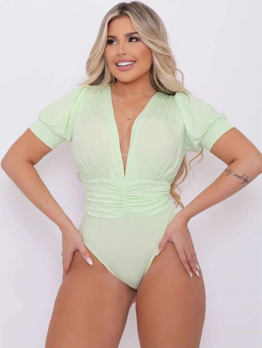 Body Feminino Manga Curta Bufante com Decote V Trançado