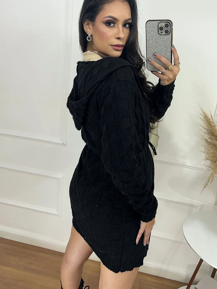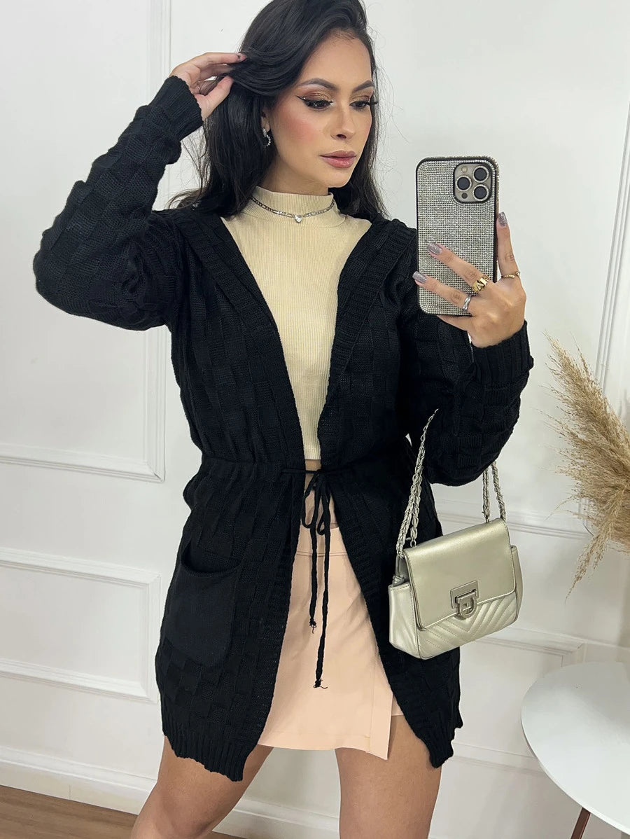 Cardigan Tricot Feminino com Capuz e Cordão – Modelo Quadradinha