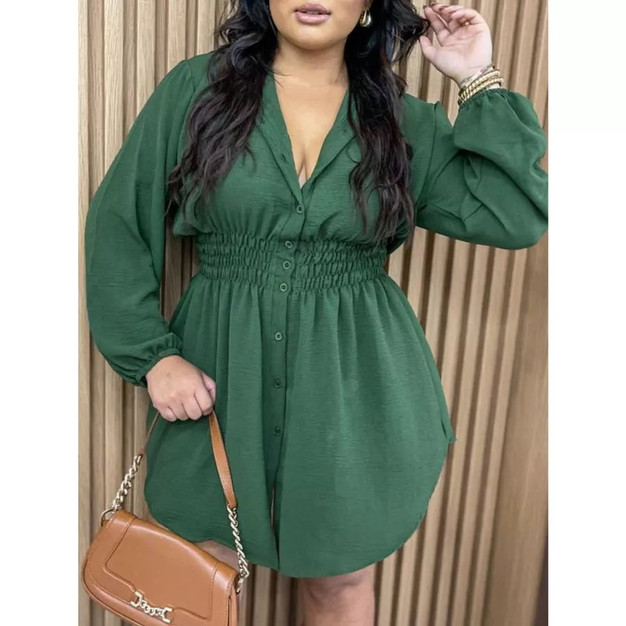 Chamise Manga Longa de Botões Lastex na Cintura, Vestido Feminino.