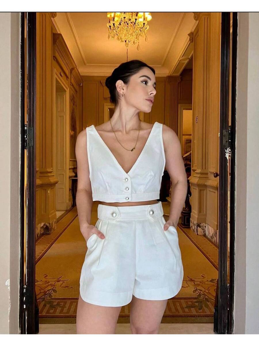 Conjunto com Botões Tecido Premium Cropped + Short é a união perfeita entre frescor, maciez e sofisticação. Desenvolvido em tecido revestido de alta qualidade, ele garante leveza e conforto para momentos especiais, sendo ideal para a praia, datas comemorativas ou ocasiões românticas.