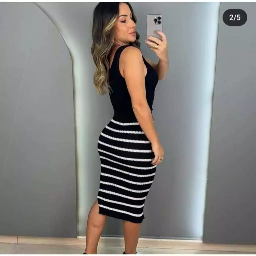 Conjunto de Tricot Feminino Saia Midi Canelada Listrada e Cropped Regata Gola V Liso Moda
