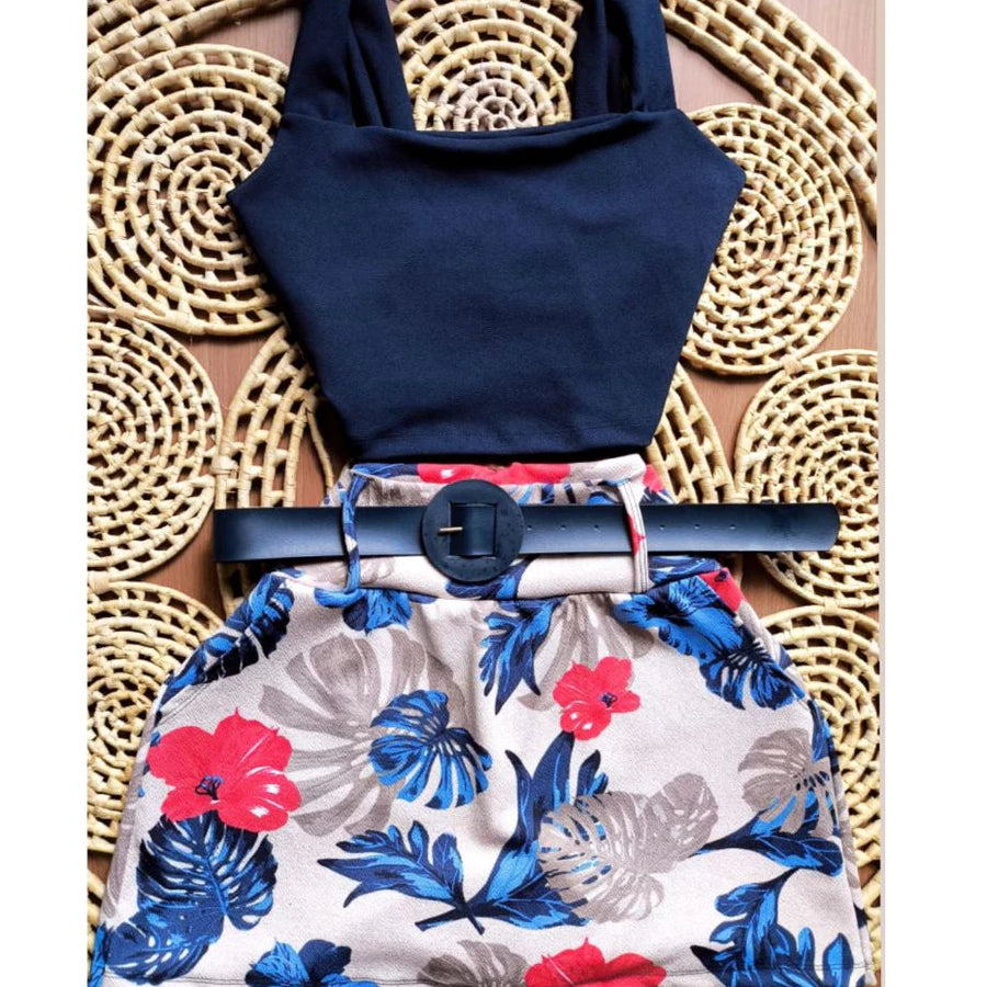 - Peças: Blusa Cropped + Short Saia com Cinto