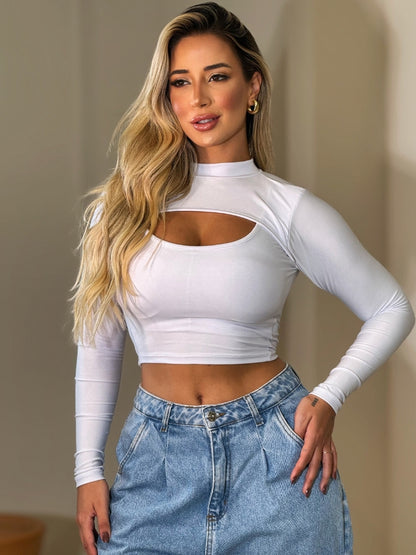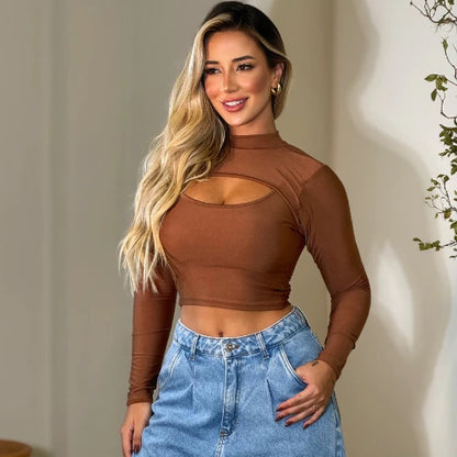 Cropped Corsellet manga Longa Gola Alta Com Decote e Recorte Tendência Outono