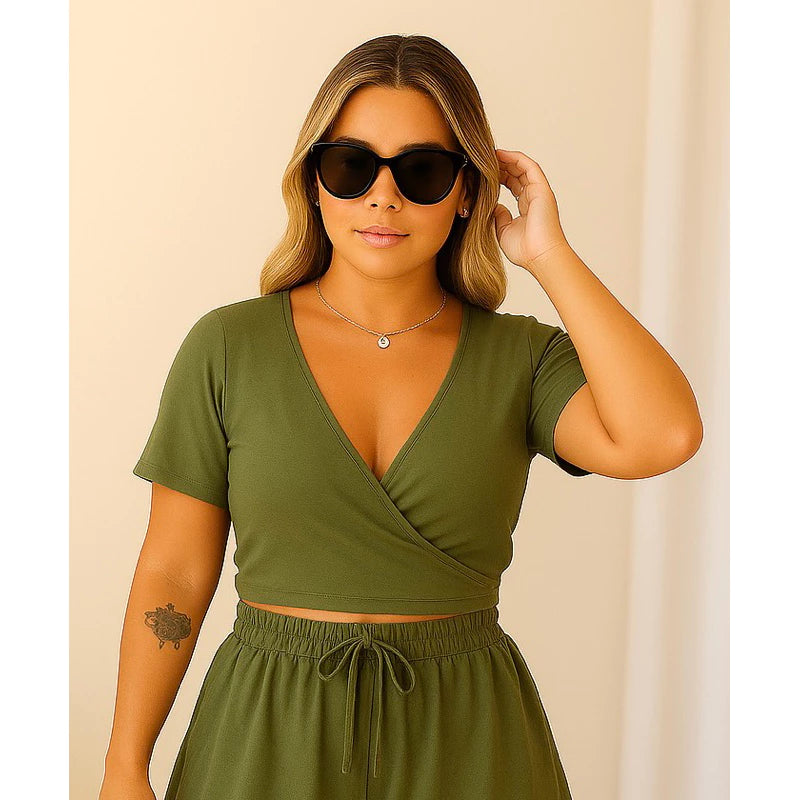 Dica de uso: Combine com calça de cintura alta, saia ou shorts para destacar as diferentes formas do cropped.