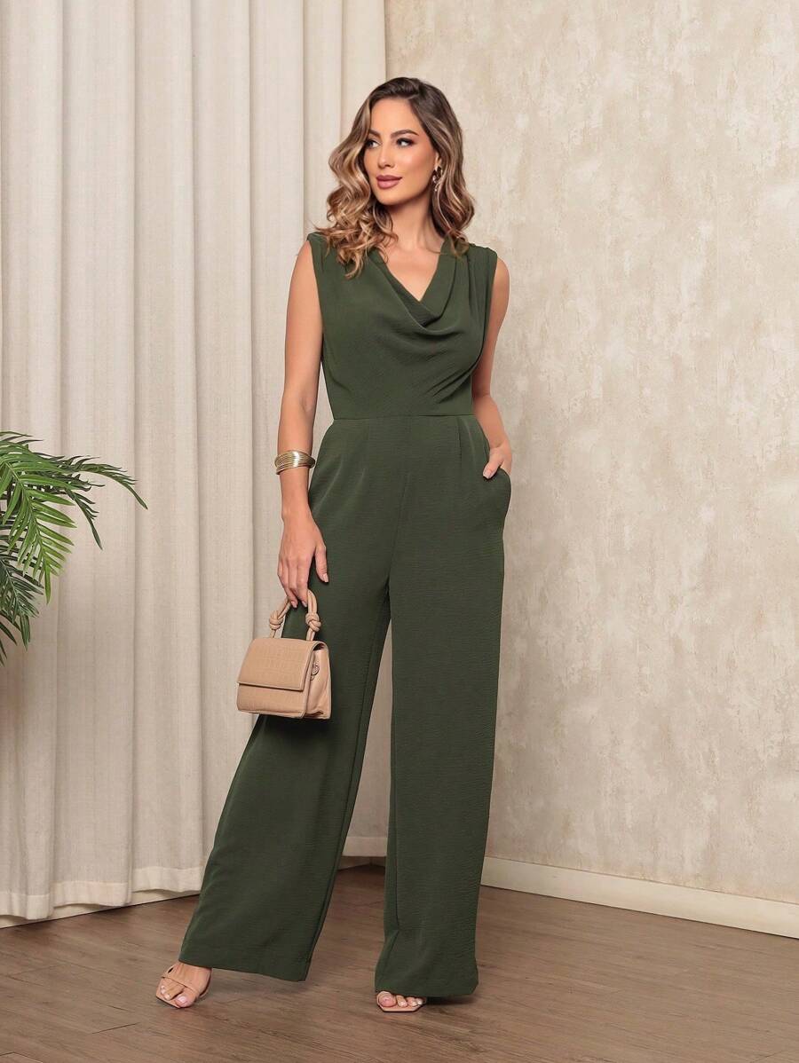 Macacão Longo Feminino em Duna - Decote Sofisticado e Bolsos Laterais