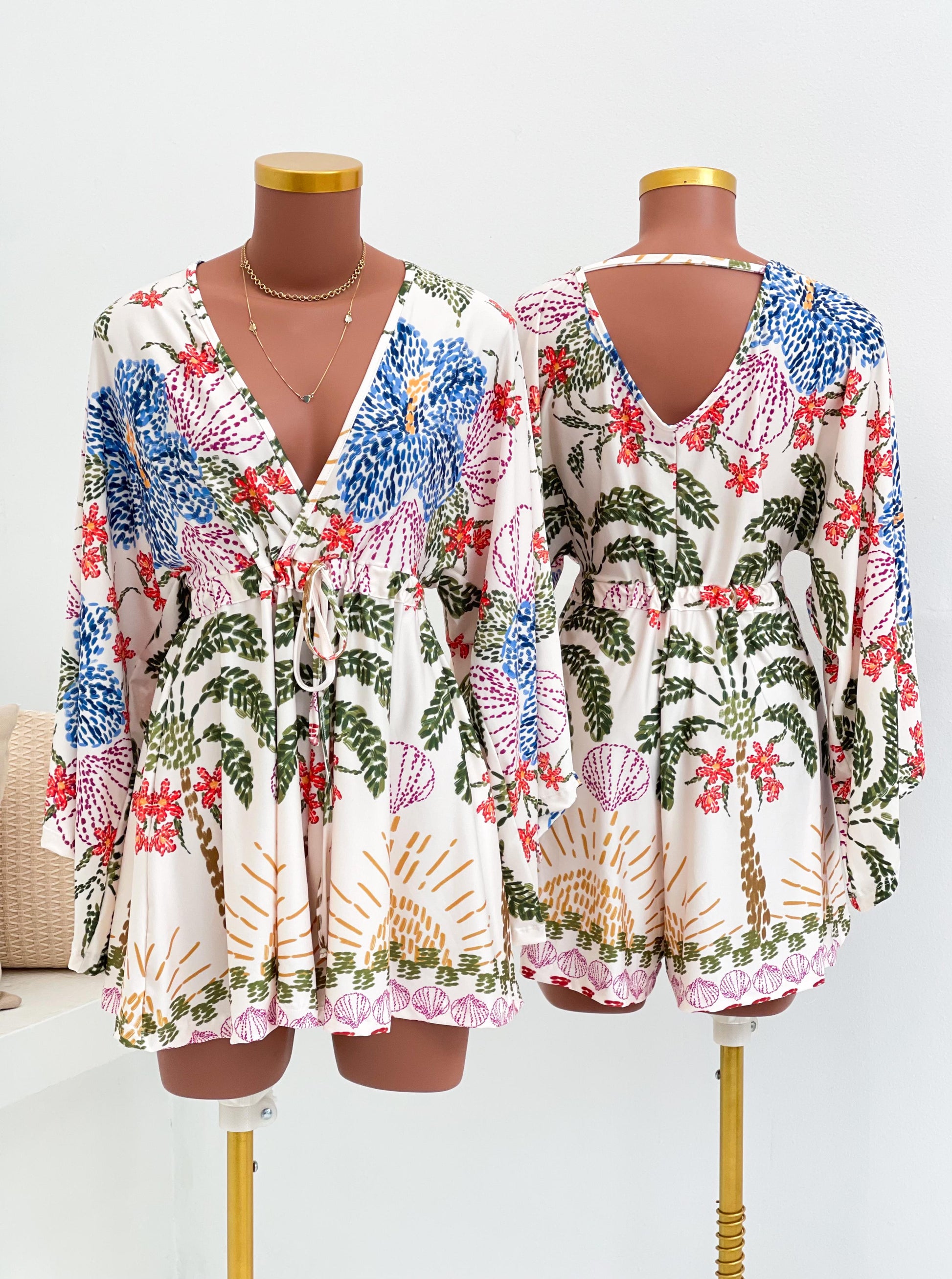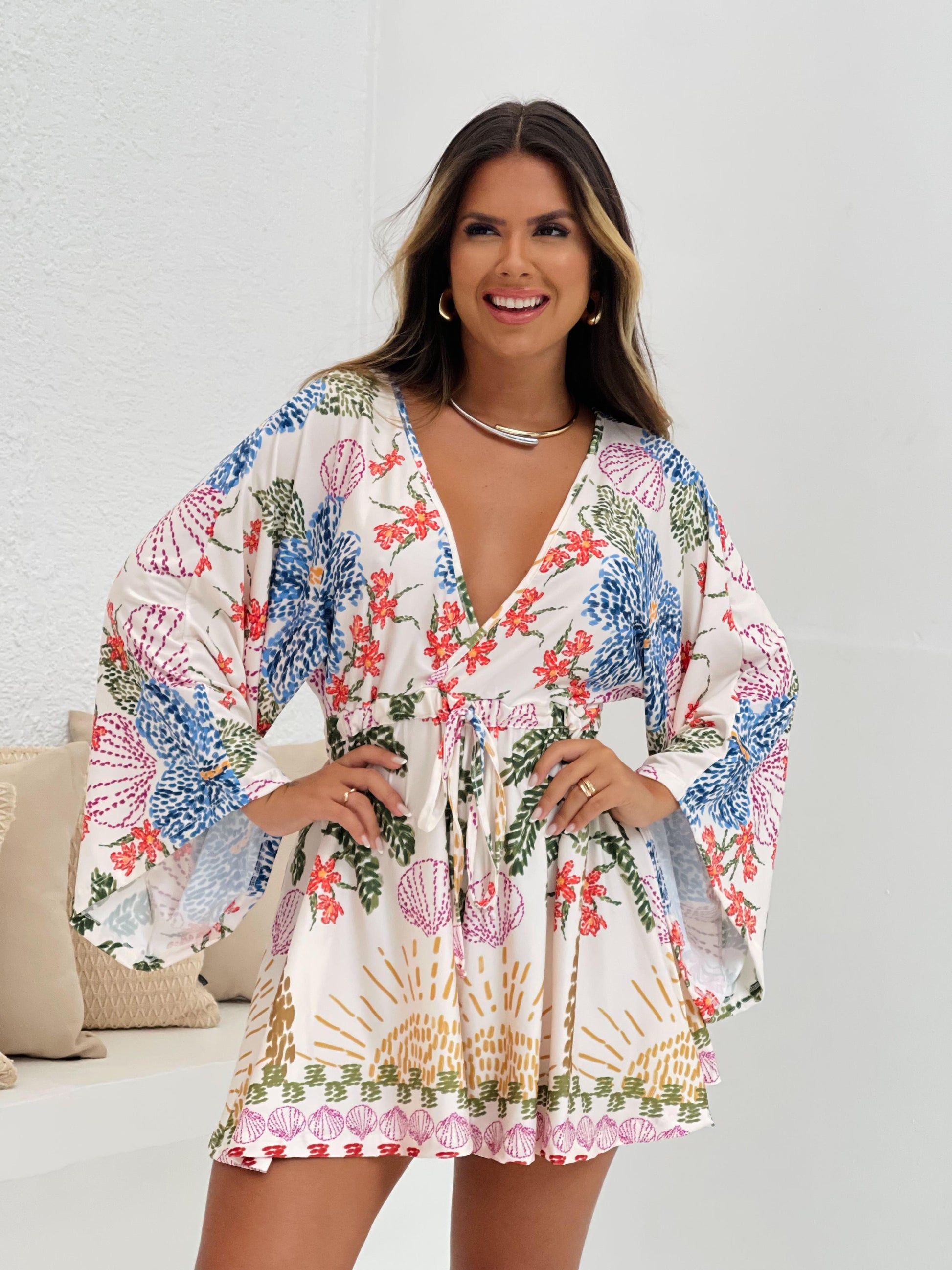 Macaquinho com Decote V, Mangas Amplas e Cintura Ajustável