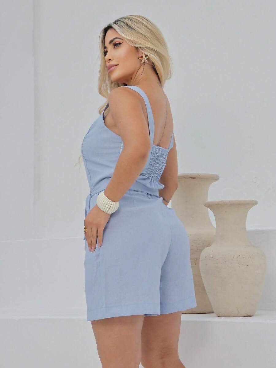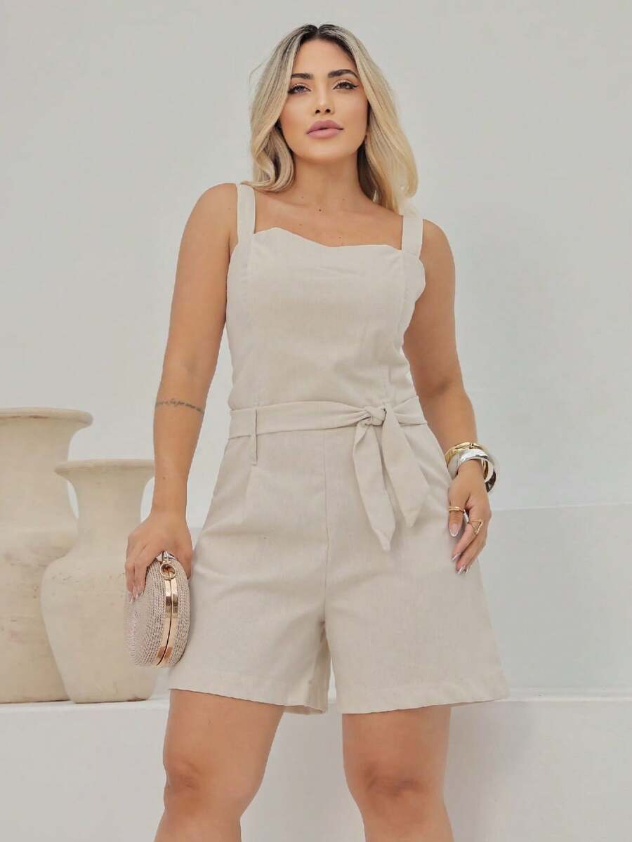 Macaquinho Feminino Giovana em Linho com Cinto e Bolsos