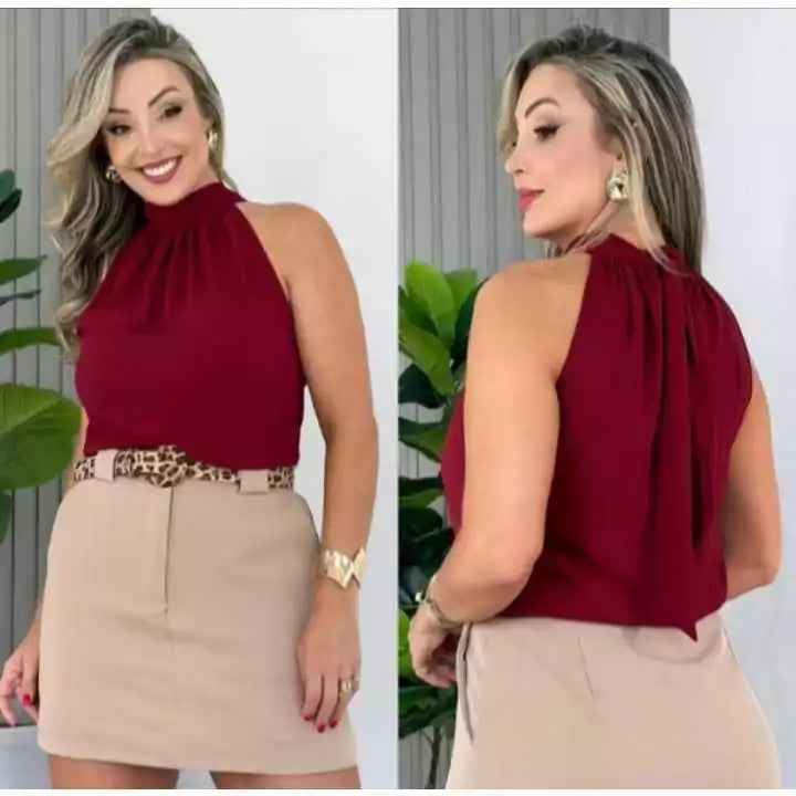 - Modelo: Regata com gola alta plissada e amarração nas costas
