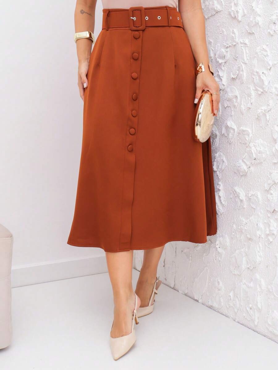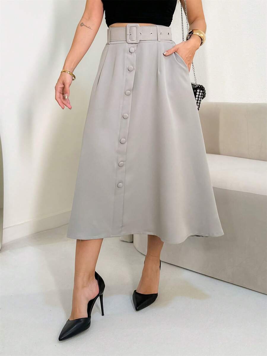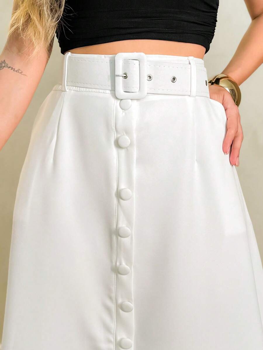 Saia Longa Monocromática em Alfaiataria com Bolsos, Zíper, Botão e Cinto
