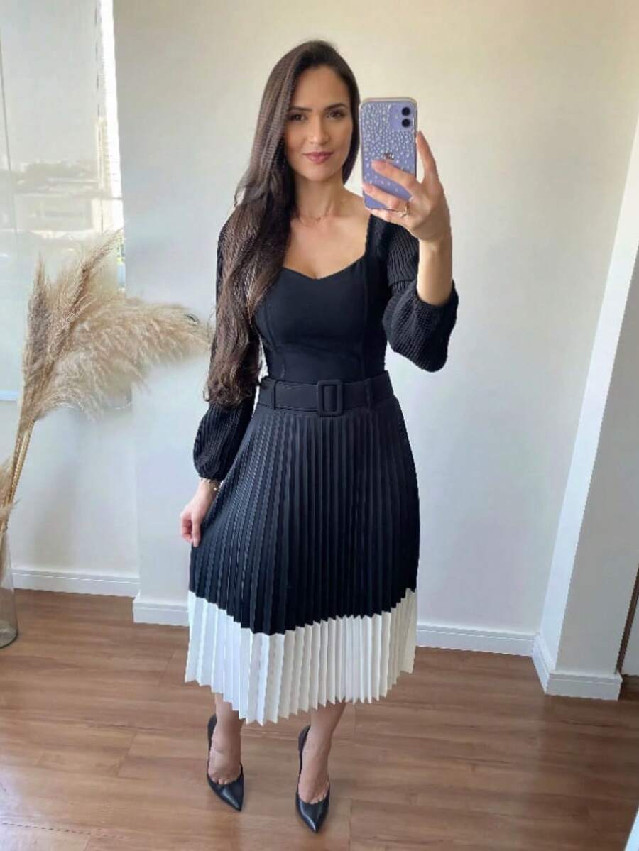 - Detalhes: Plissada, bicolor, acompanha cinto