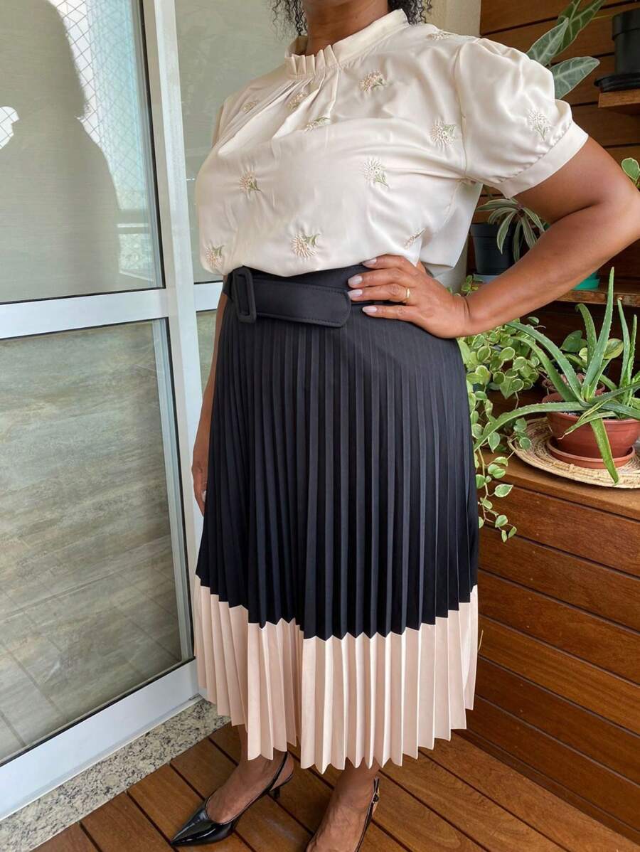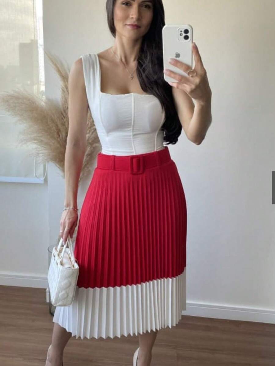 Saia Plissada Bicolor Forrada com Cinto e Elástico na Cintura
