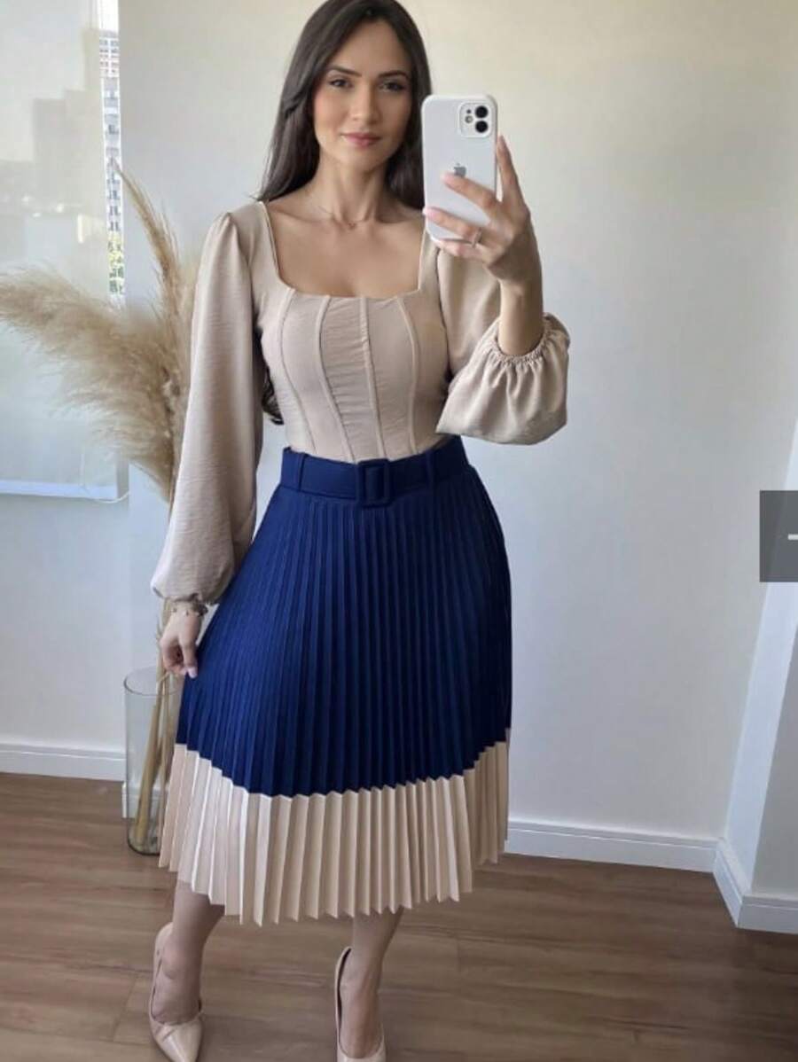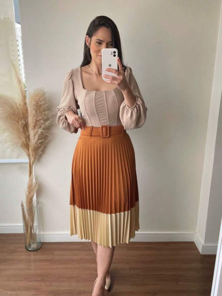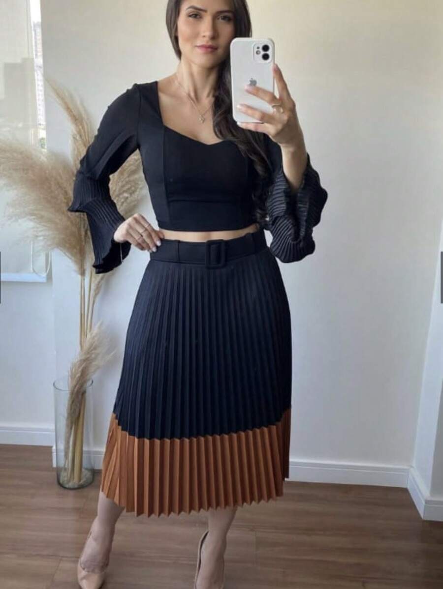 Garanta já a sua Saia Plissada Bicolor Forrada e arrase com estilo, conforto e elegância!
