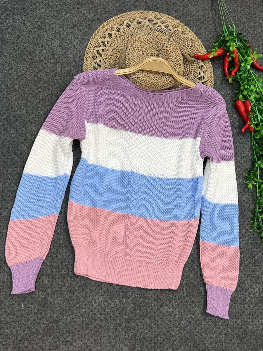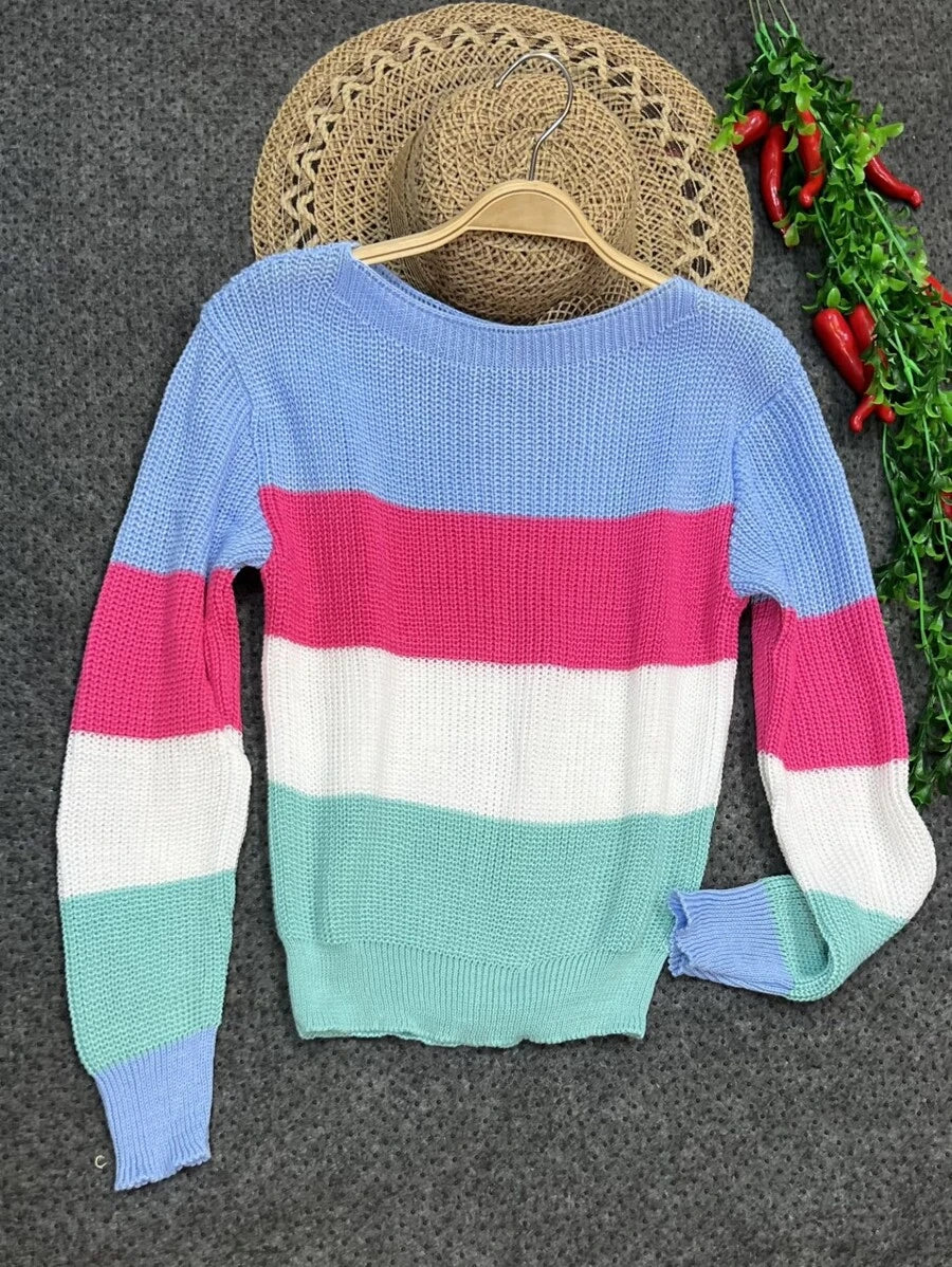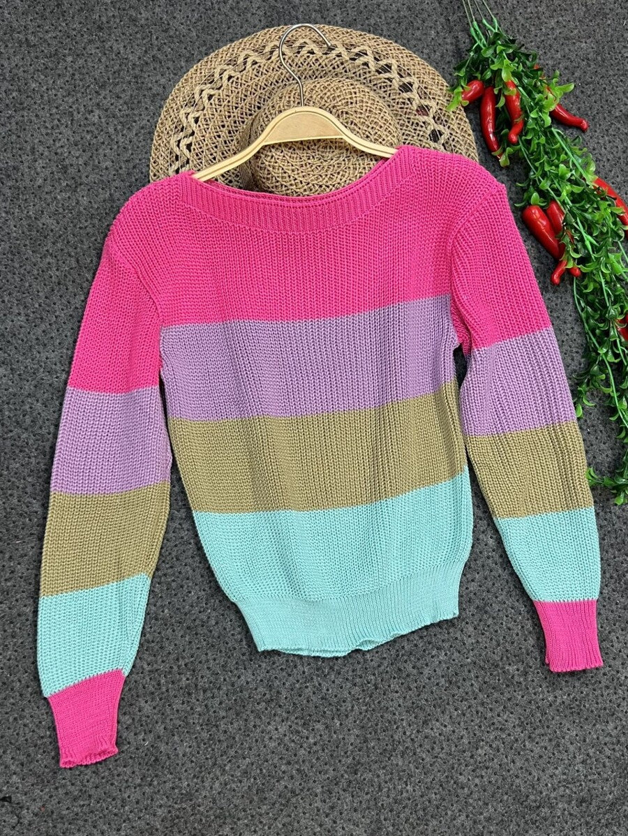 Suéter de Tricô Feminino Gola Redonda com Listras Arco-Íris – Manga Longa