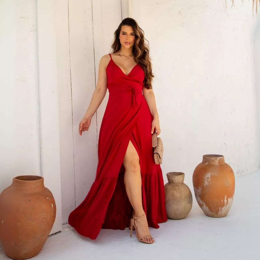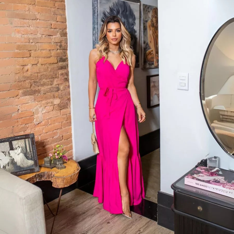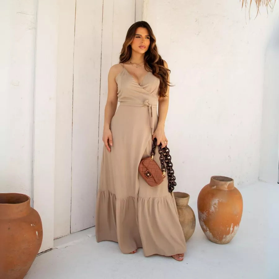Adicione um toque de charme ao seu guarda-roupa com o Vestido Envelope Longo com Alça, perfeito para transitar entre o casual e o sofisticado com leveza e estilo.