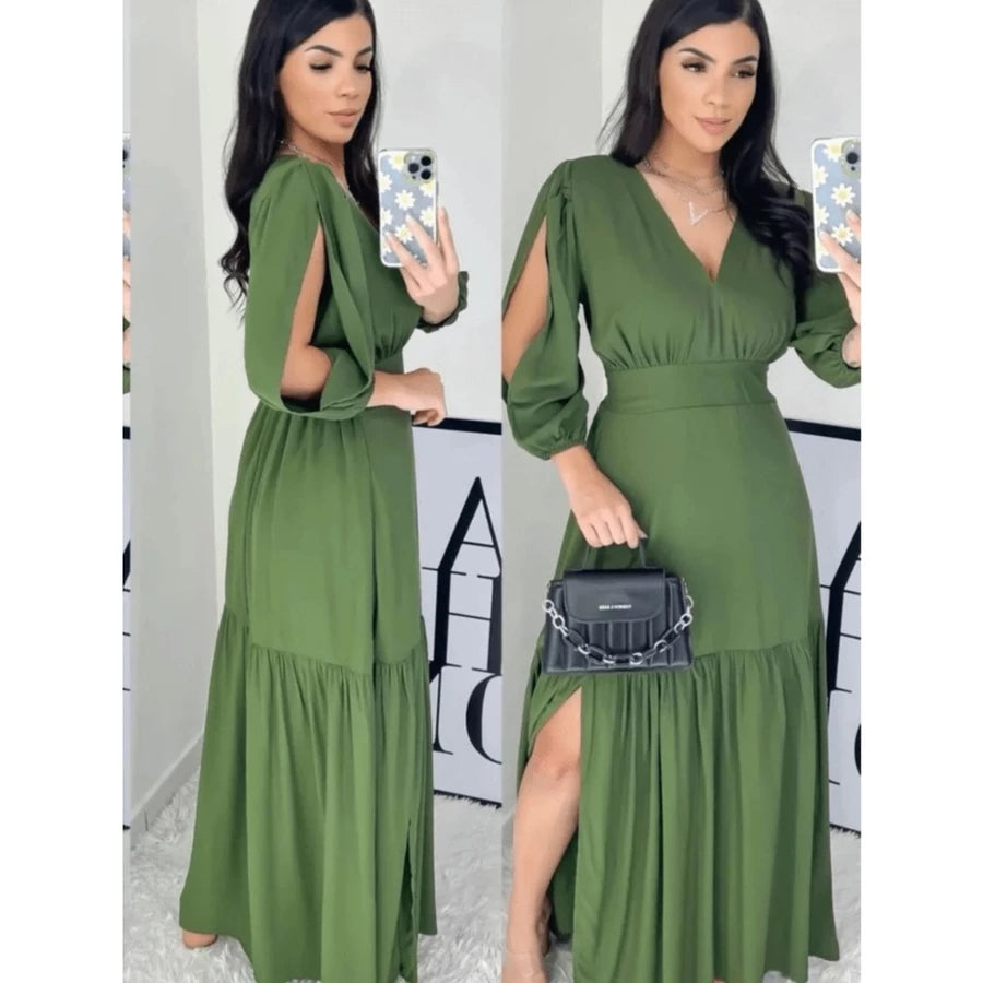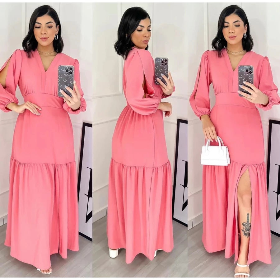 Vestido manga 3/4 com fenda longo feminino tecido Duna e viscolinho abertura nas Manga.
