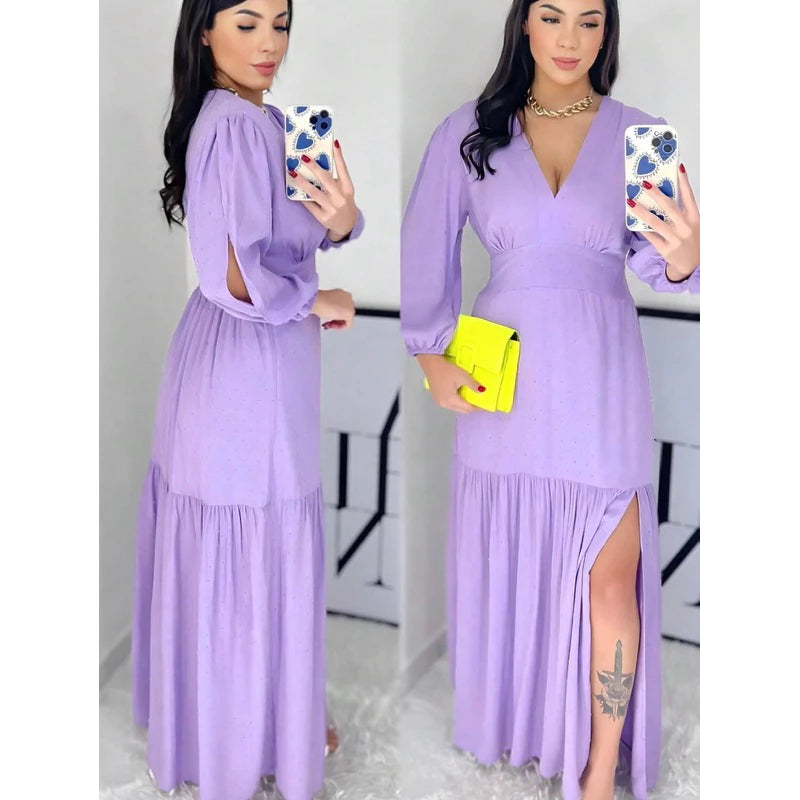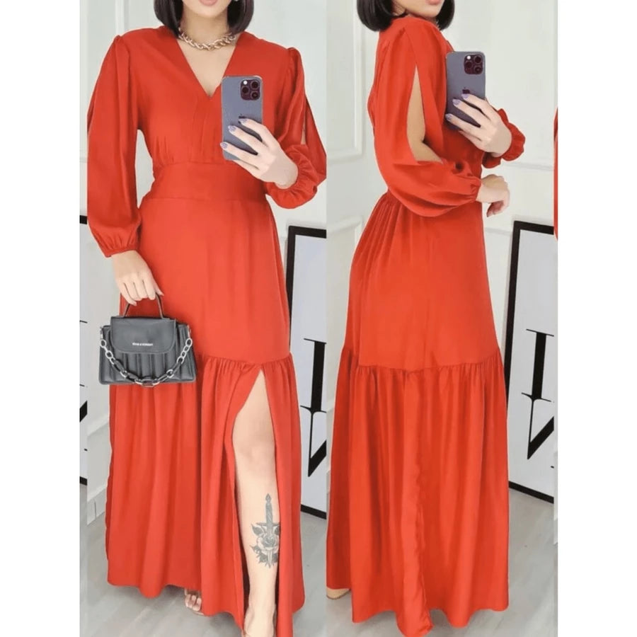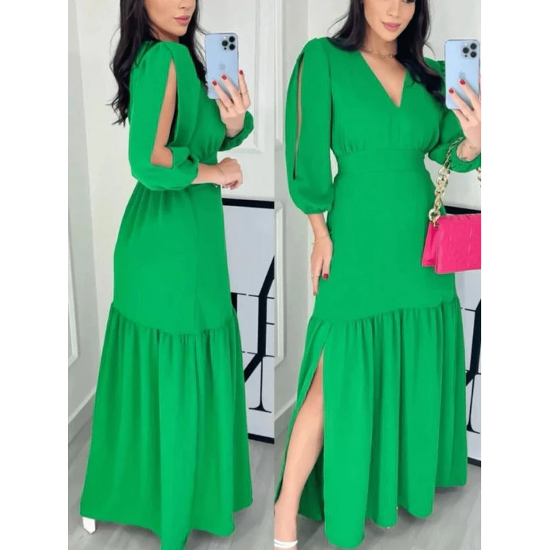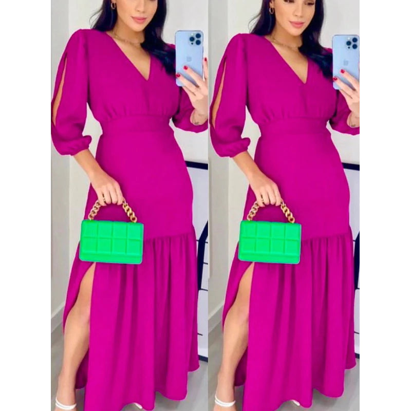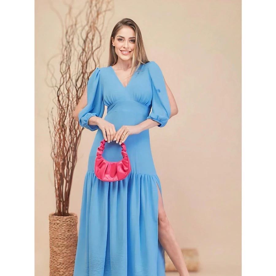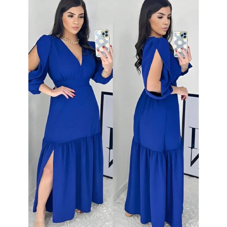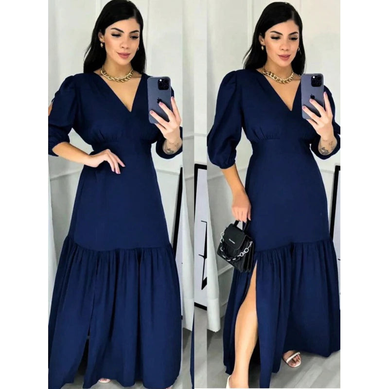 Vestido Longo Feminino Manga 3/4 com Fenda – Tecido Duna e Viscolinho