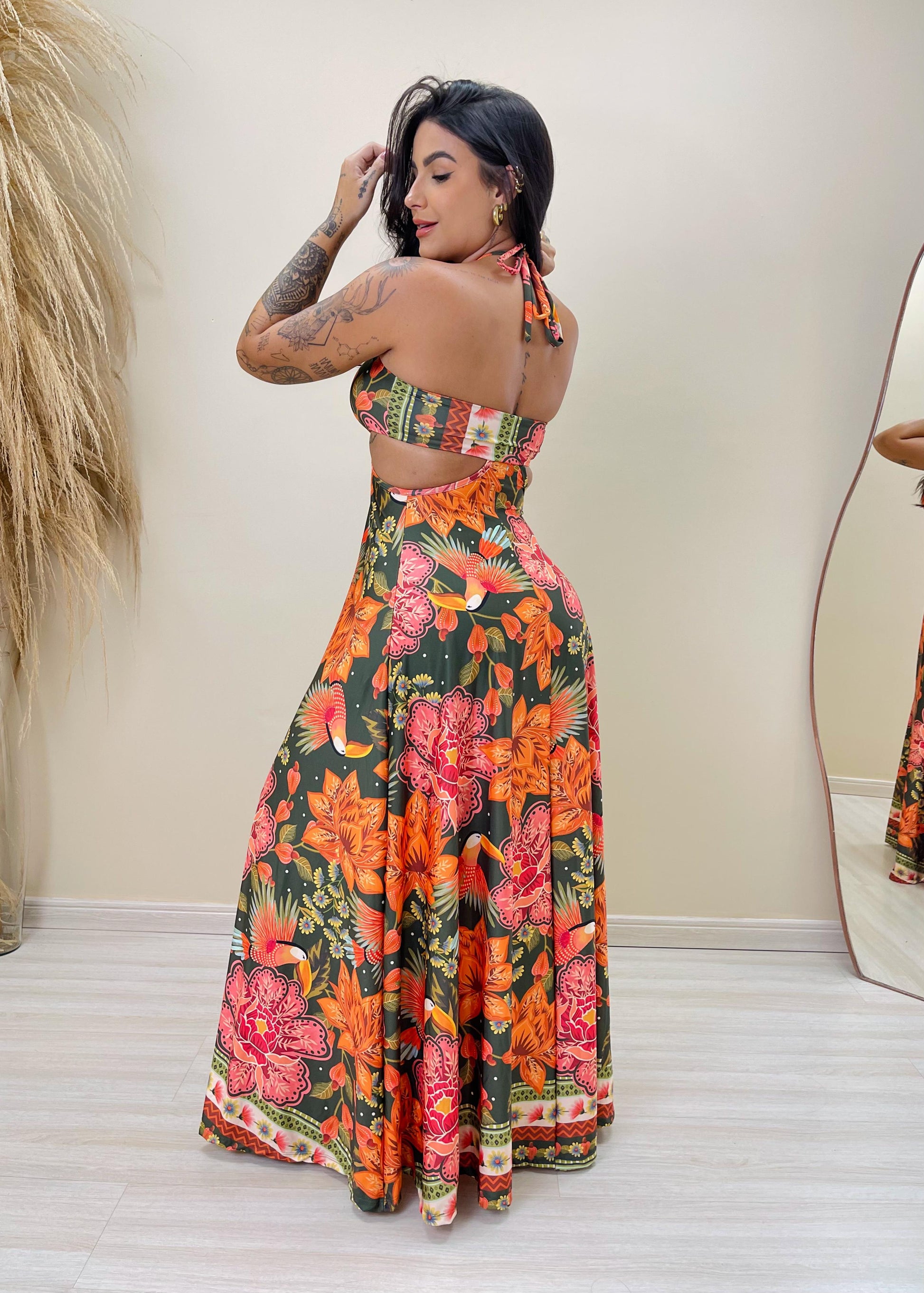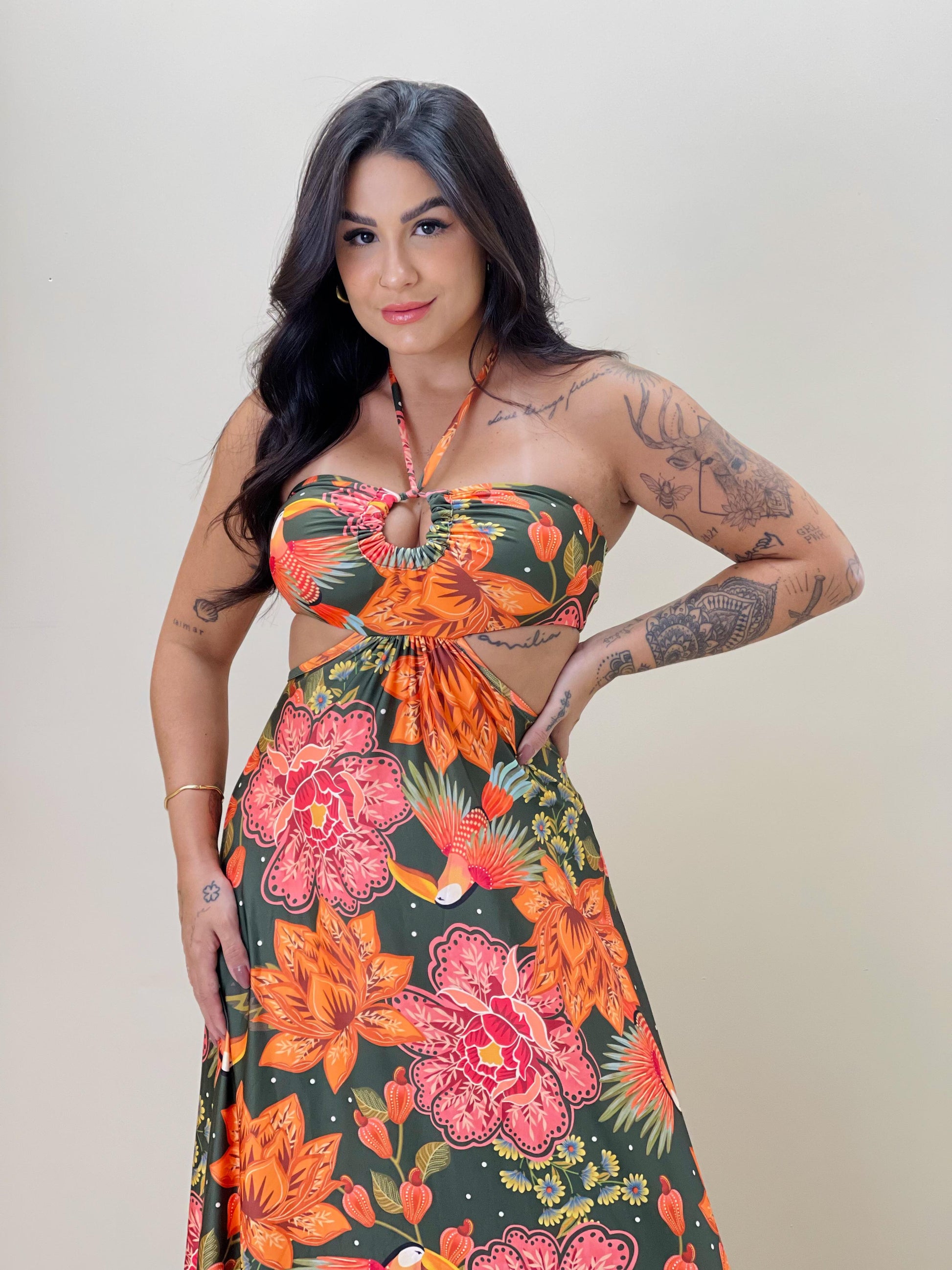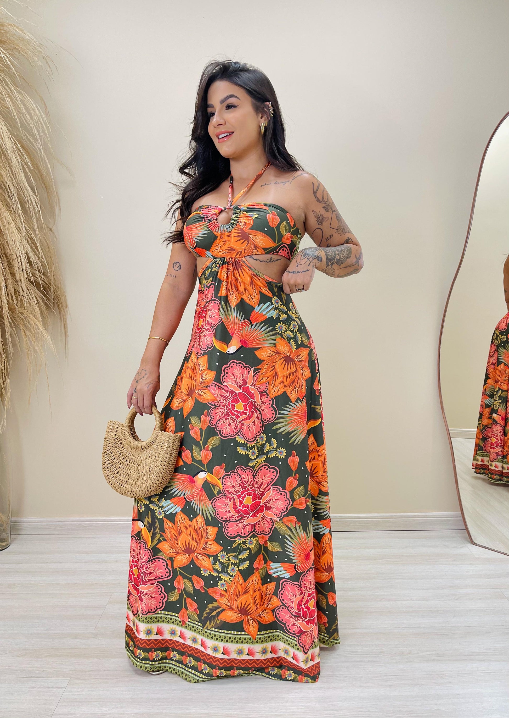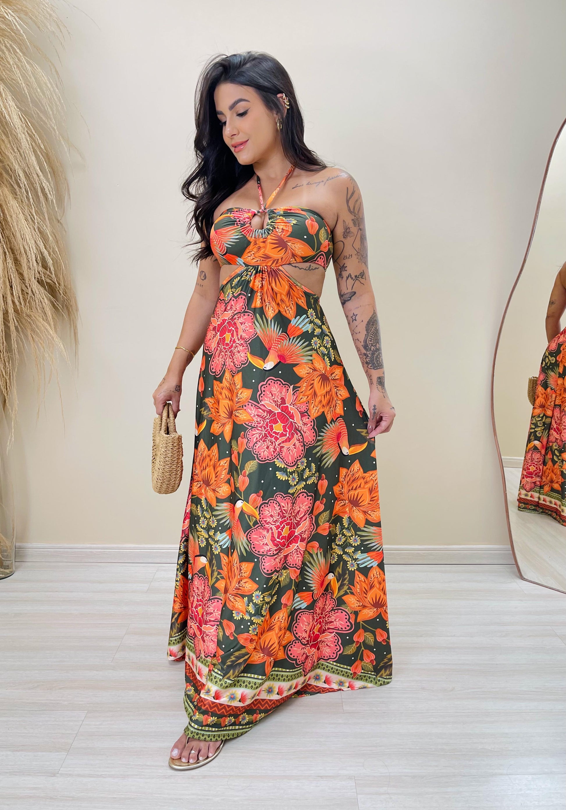 Este vestido longo é a união perfeita entre charme e conforto. Com uma estampa exclusiva cheia de vida, ele exala elegância e personalidade. O modelo tomara que caia com amarração no pescoço realça o colo e os ombros, enquanto os recortes laterais e a saia evasê valorizam a silhueta de forma leve e sofisticada.