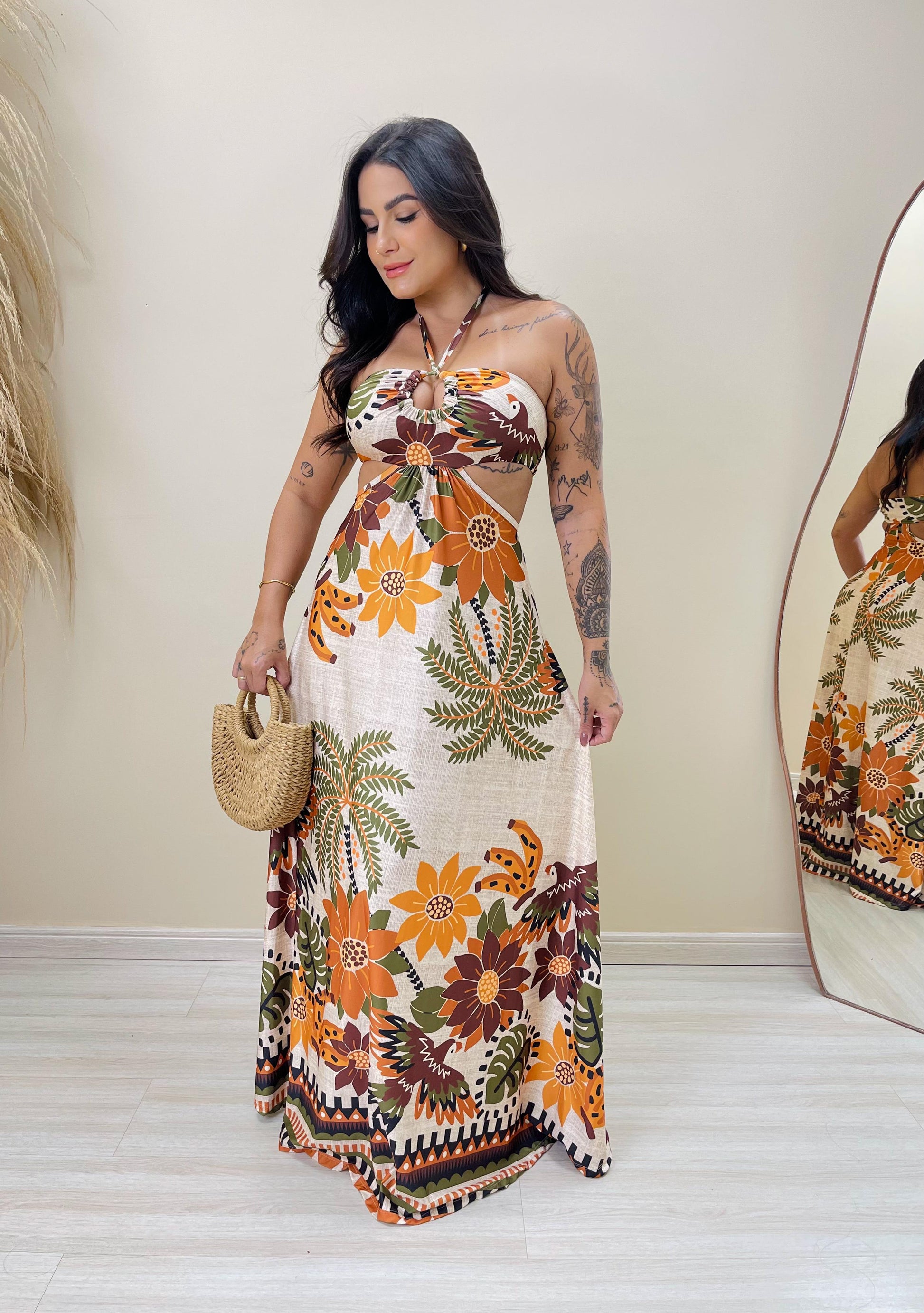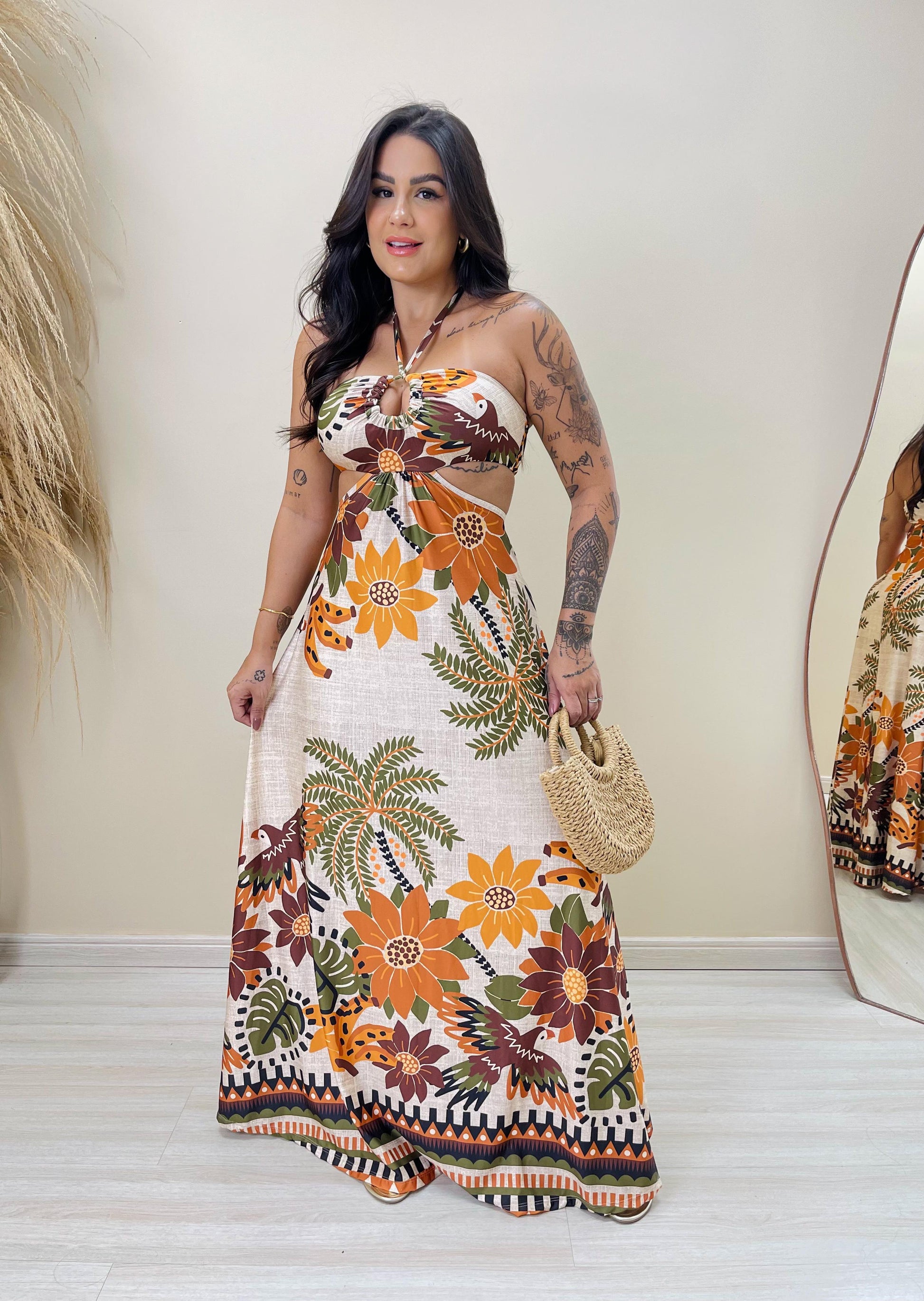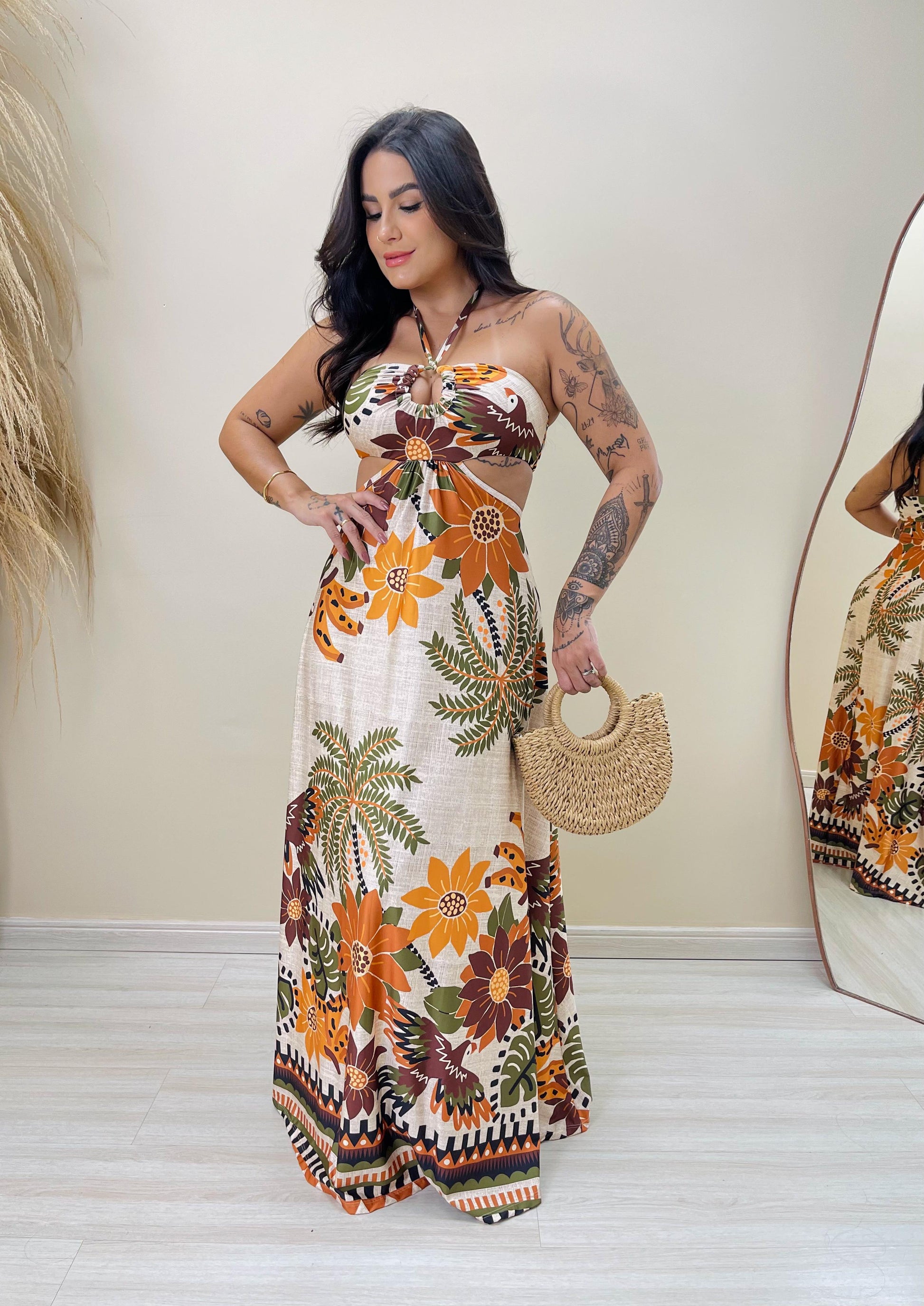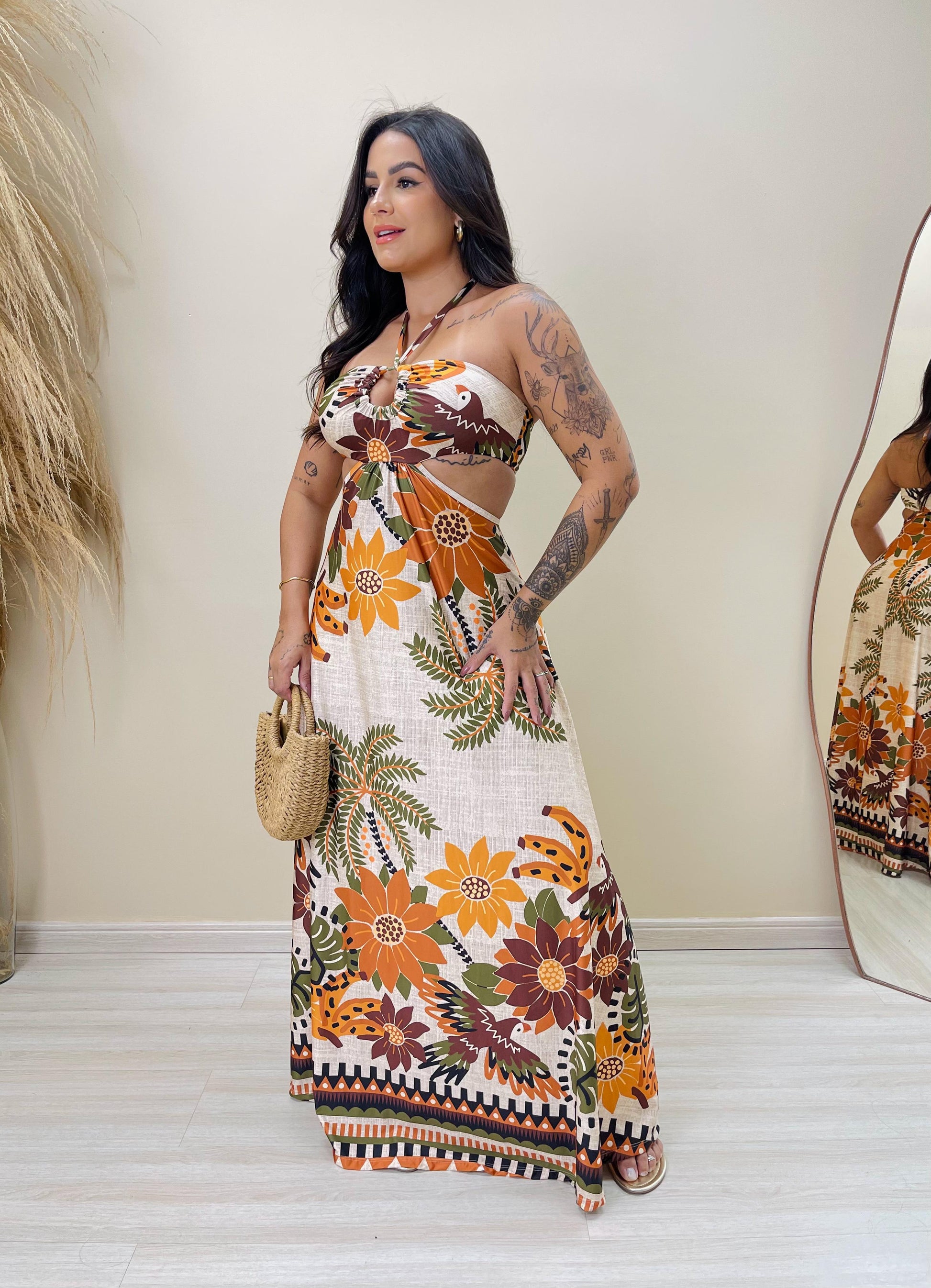 Este vestido longo é a união perfeita entre charme e conforto. Com uma estampa exclusiva cheia de vida, ele exala elegância e personalidade. O modelo tomara que caia com amarração no pescoço realça o colo e os ombros, enquanto os recortes laterais e a saia evasê valorizam a silhueta de forma leve e sofisticada.